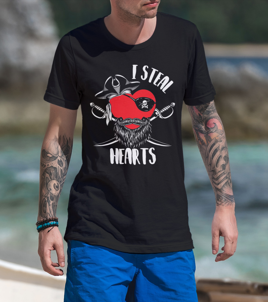 I Steal Hearts Funny Valentines Day Pirate Beard Patch Swords T-Shirt