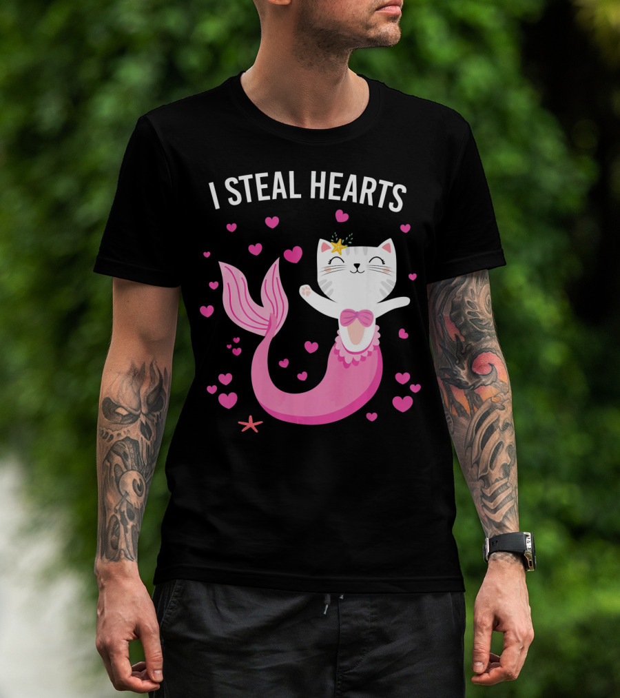 I Steal Hearts Purrmaid Cat Mermaid With Pink Hearts T-Shirt