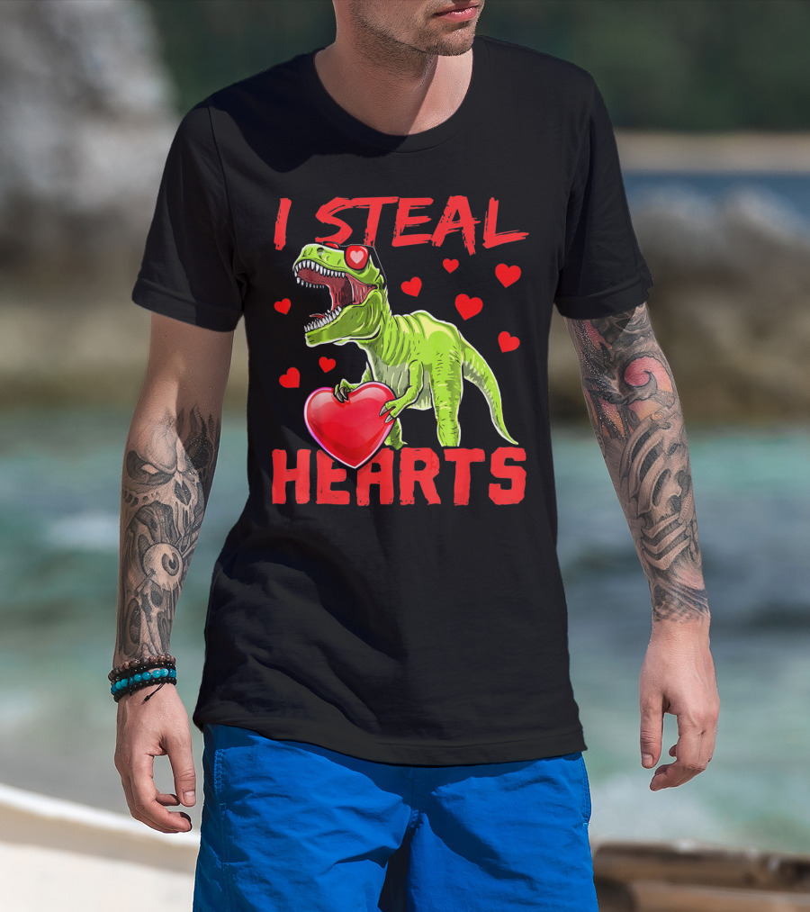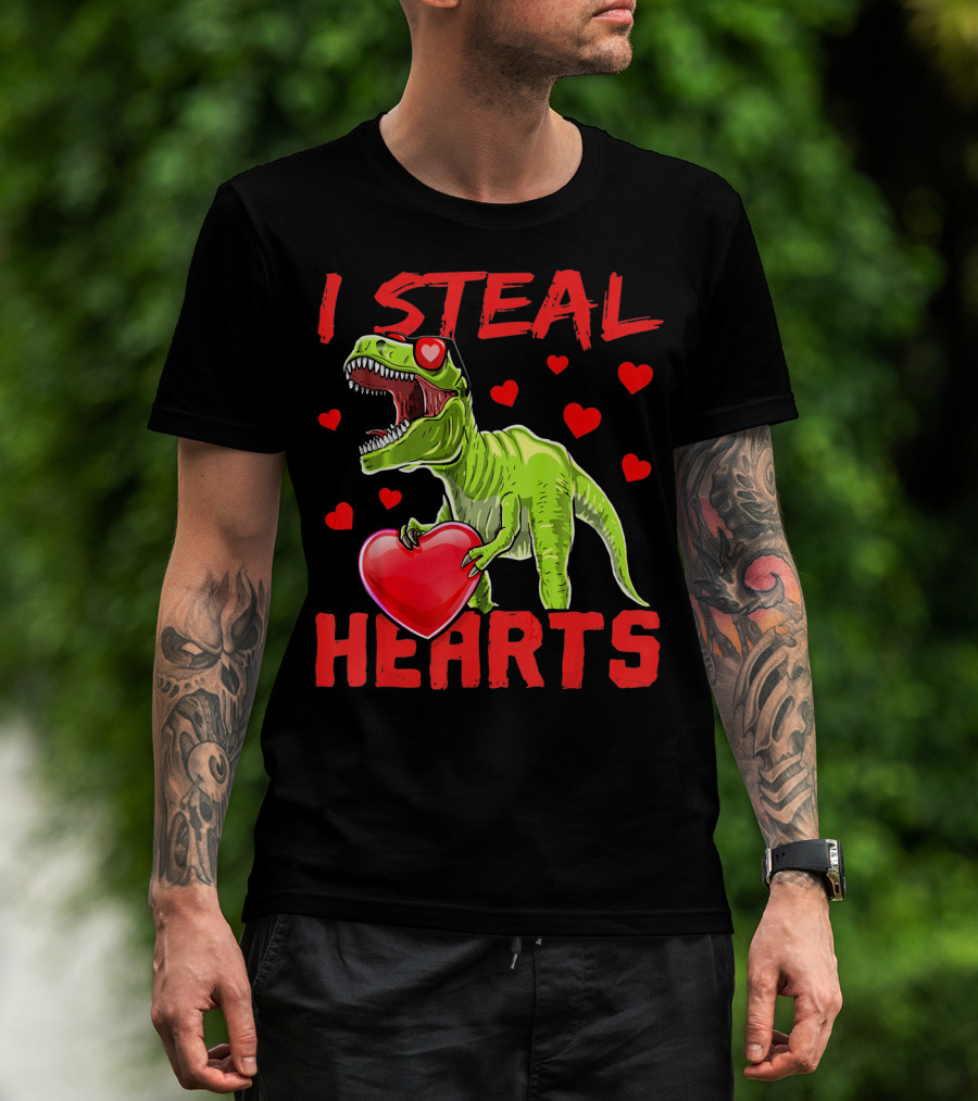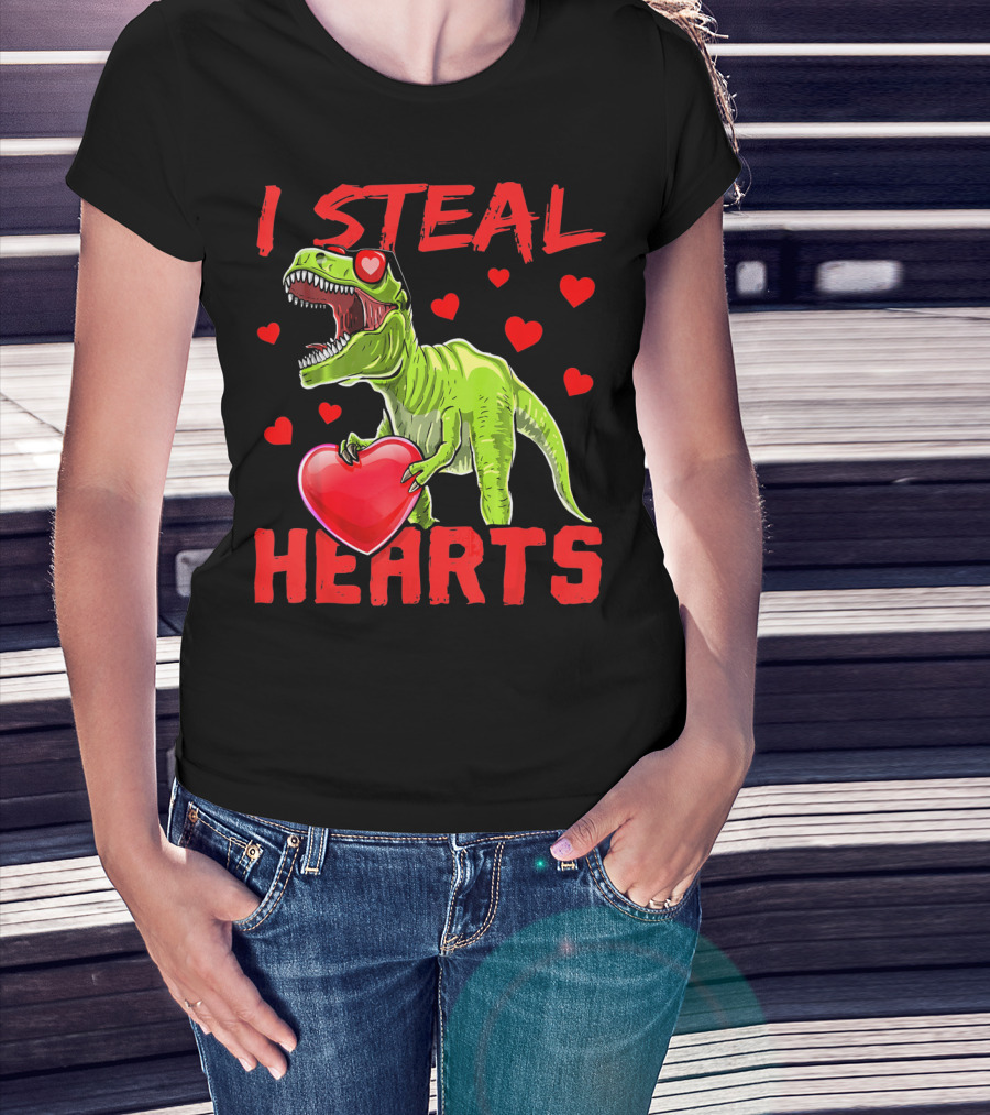 I Steal Hearts Valentines Day Rex Dino Holding Heart Surrounded By Hearts T-Shirt