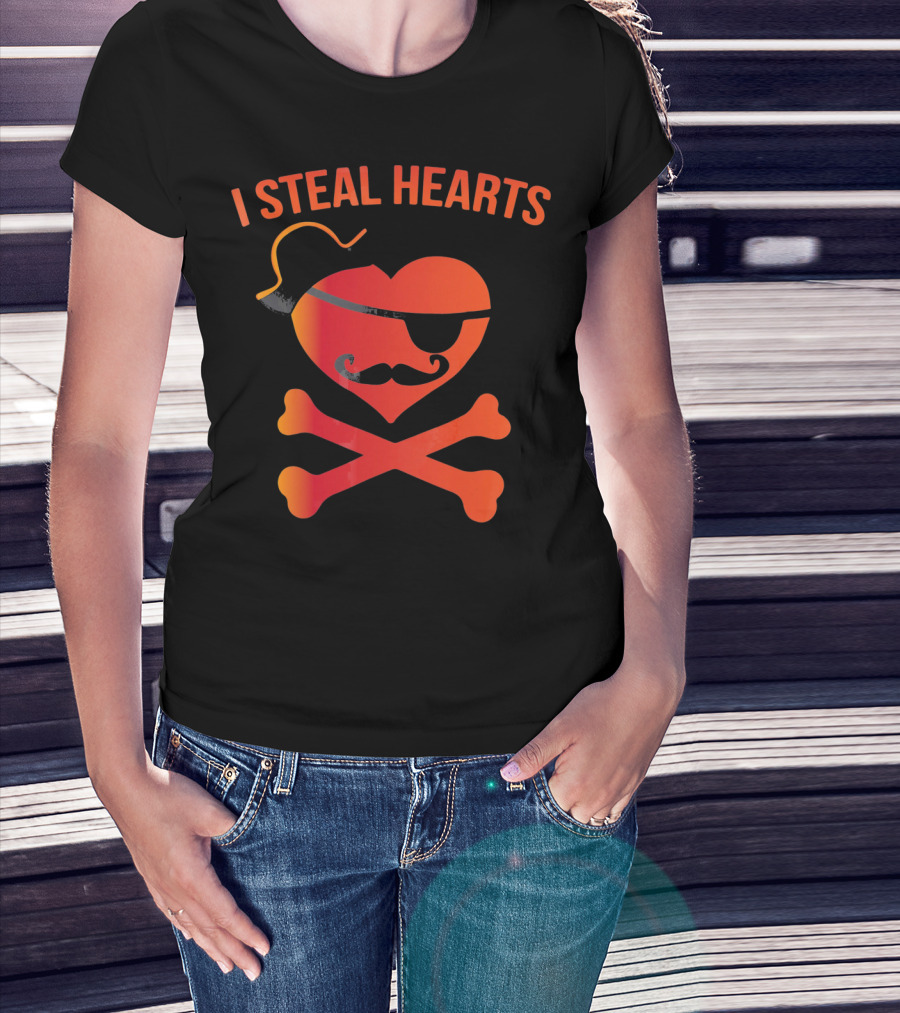 The I Steal Hearts Pirate Valentine T-shirt is designed for everyday wear and a consistent fit. Fabric is pre-shrunk ring-spun cotton with durable stitching. See the size chart below for exact measurements.