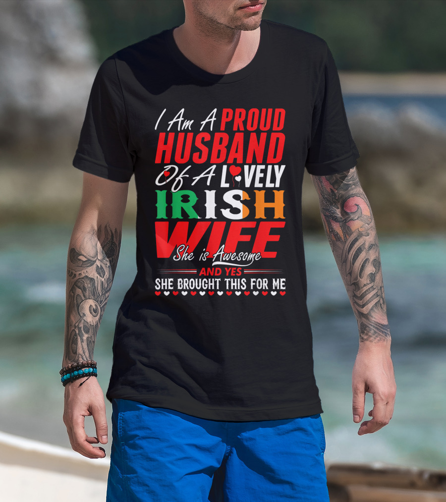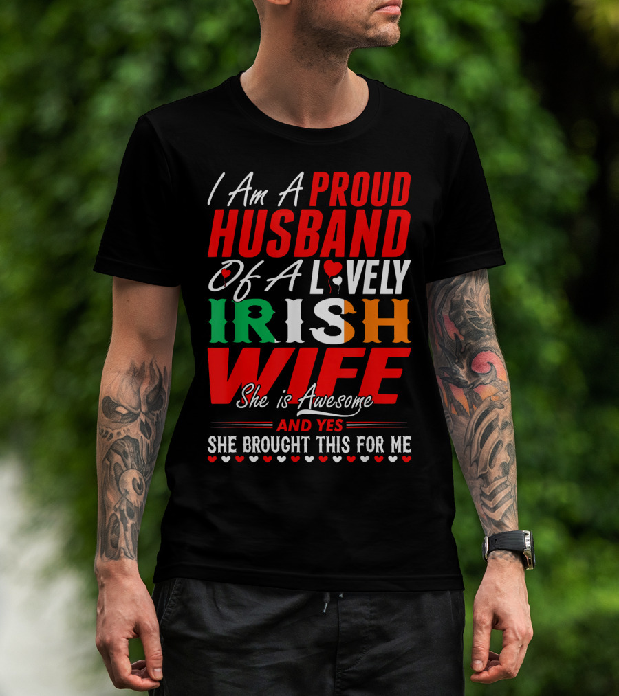 The I Am A Proud Husband Of A Lovely Irish Wife She Is Awesome And Yes She Brought This For Me T-shirt is designed for everyday wear and a consistent fit. Fabric is pre-shrunk ring-spun cotton with durable stitching. See the size chart below for exact measurements.