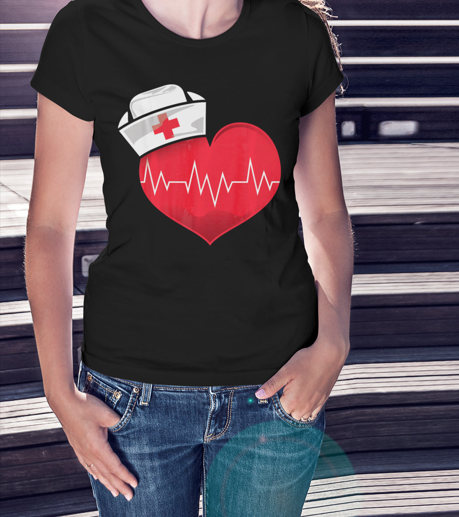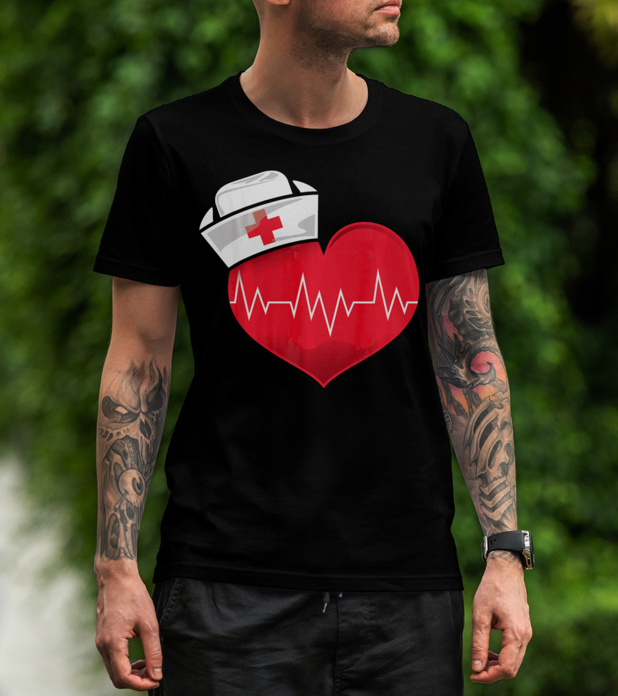 Nurse Heartbeat Valentine Costume With White Nurse Hat And Red Heartbeat Line T-Shirt