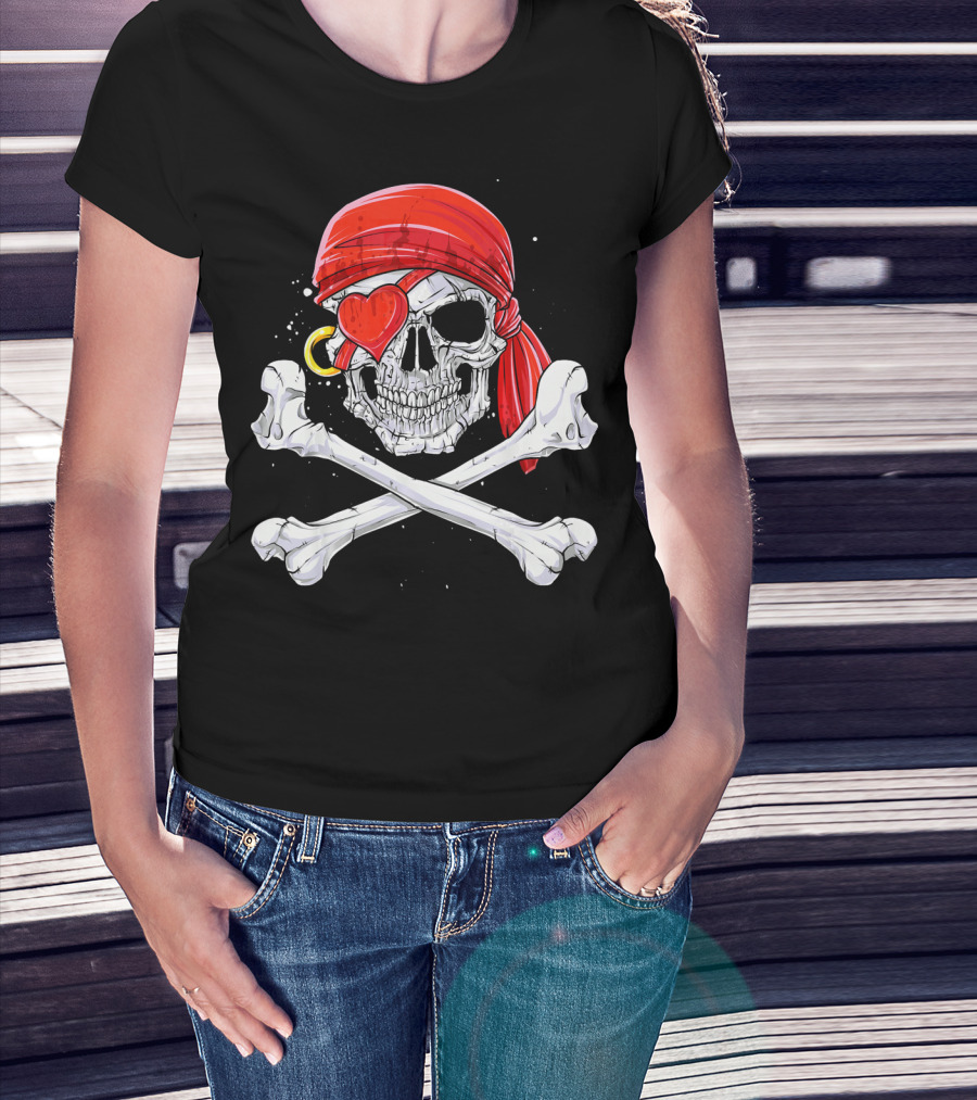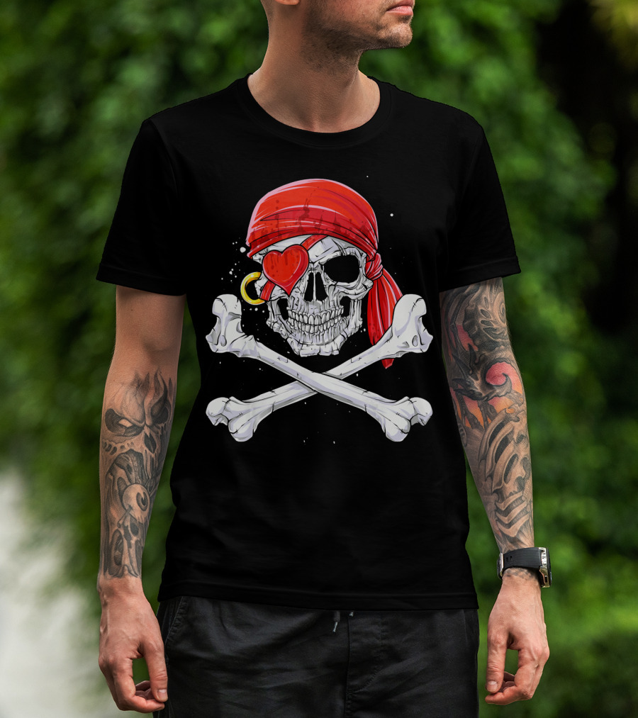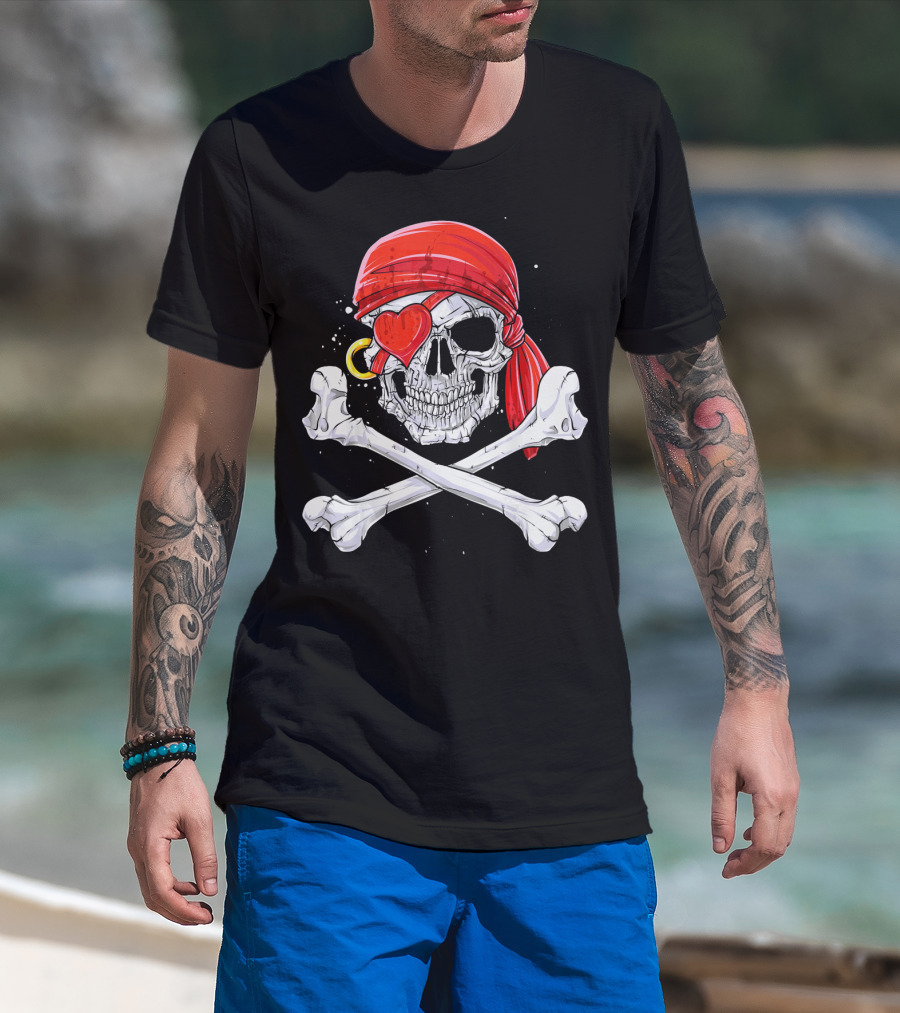 Valentine Pirate Skull With Heart Eye Patch And Crossbones T-Shirt