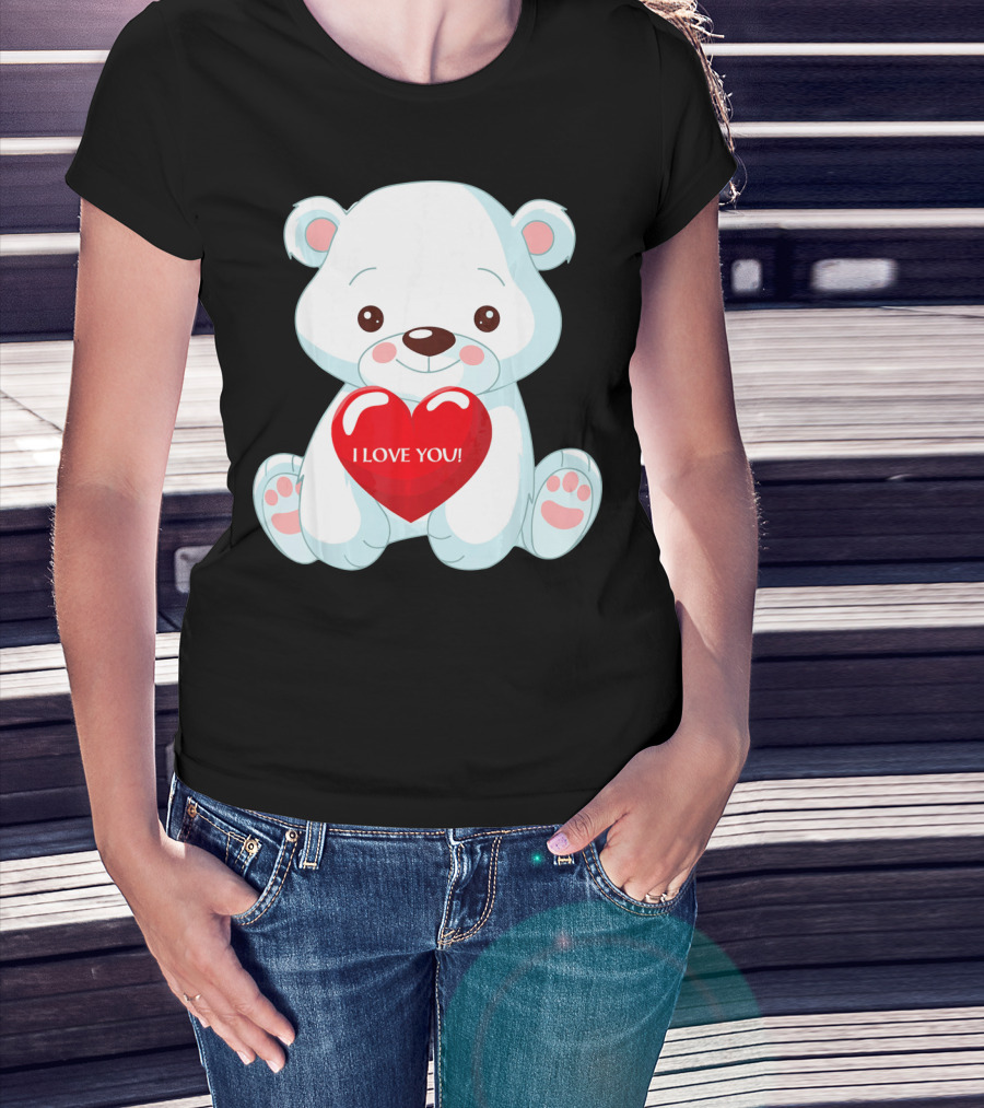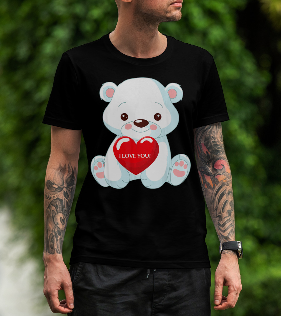 The Polar Bear Holding Heart I Love You T-shirt is designed for everyday wear and a consistent fit. Fabric is pre-shrunk ring-spun cotton with durable stitching. See the size chart below for exact measurements.