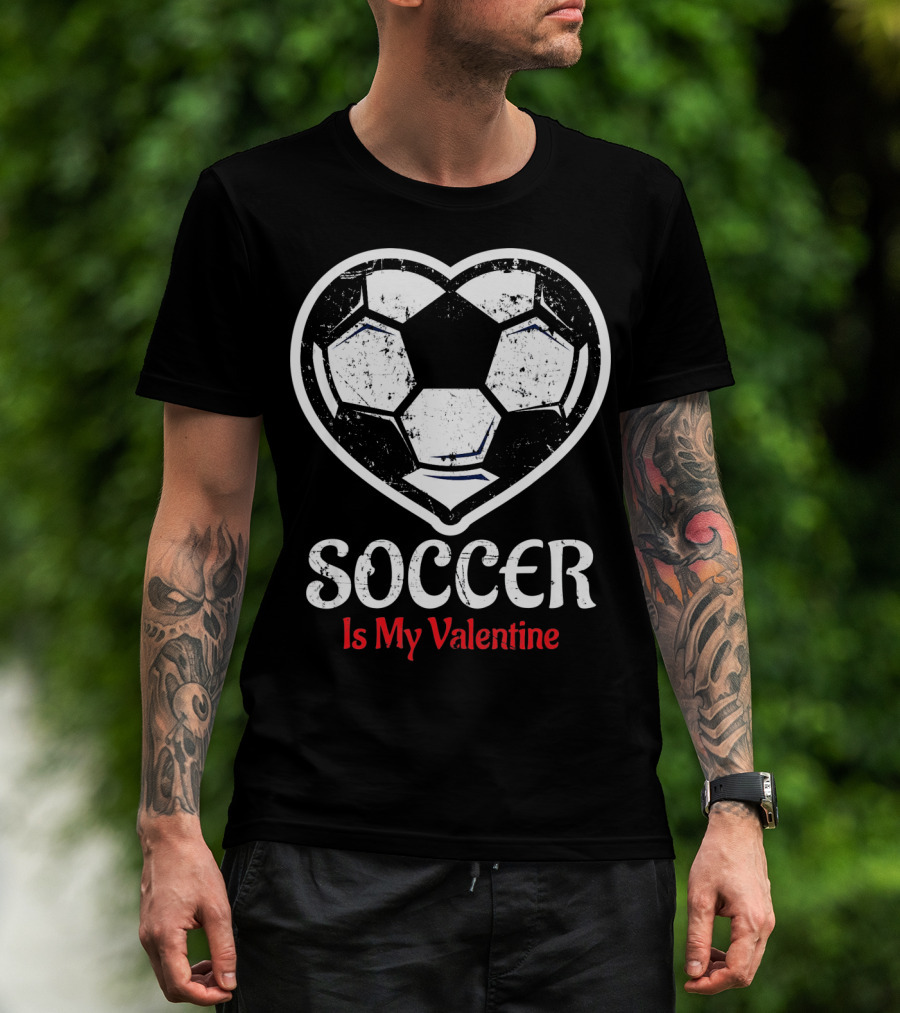 The Soccer Is My Valentine Heart-Shaped Ball Kids Vday T-shirt is designed for everyday wear and a consistent fit. Fabric is pre-shrunk ring-spun cotton with durable stitching. See the size chart below for exact measurements.