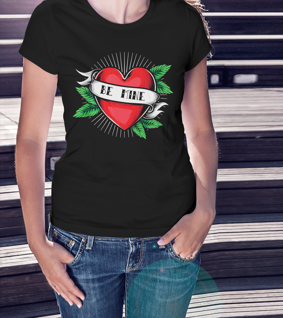 The Tattoo Heart Be Mine Valentines Day Love Banner T-shirt is designed for everyday wear and a consistent fit. Fabric is pre-shrunk ring-spun cotton with durable stitching. See the size chart below for exact measurements.