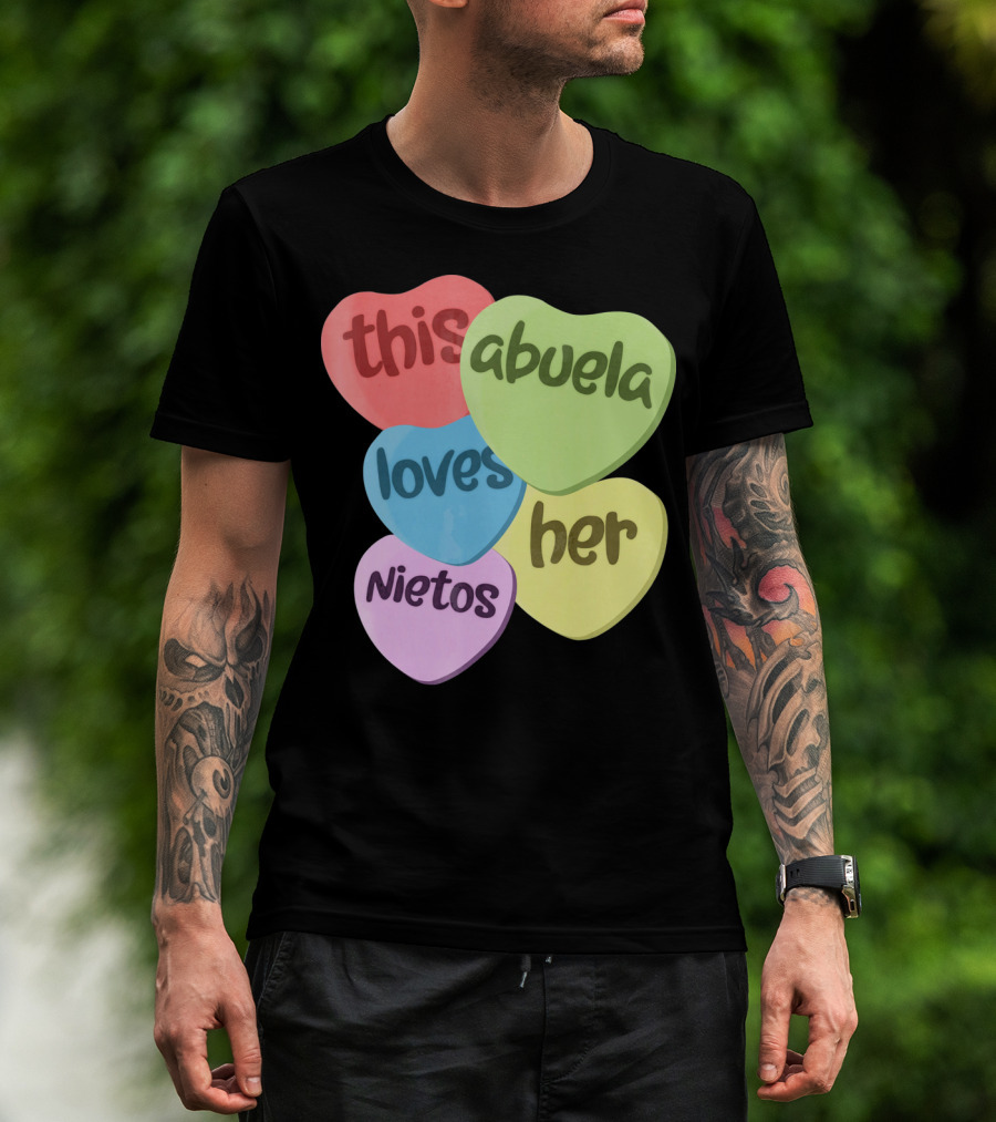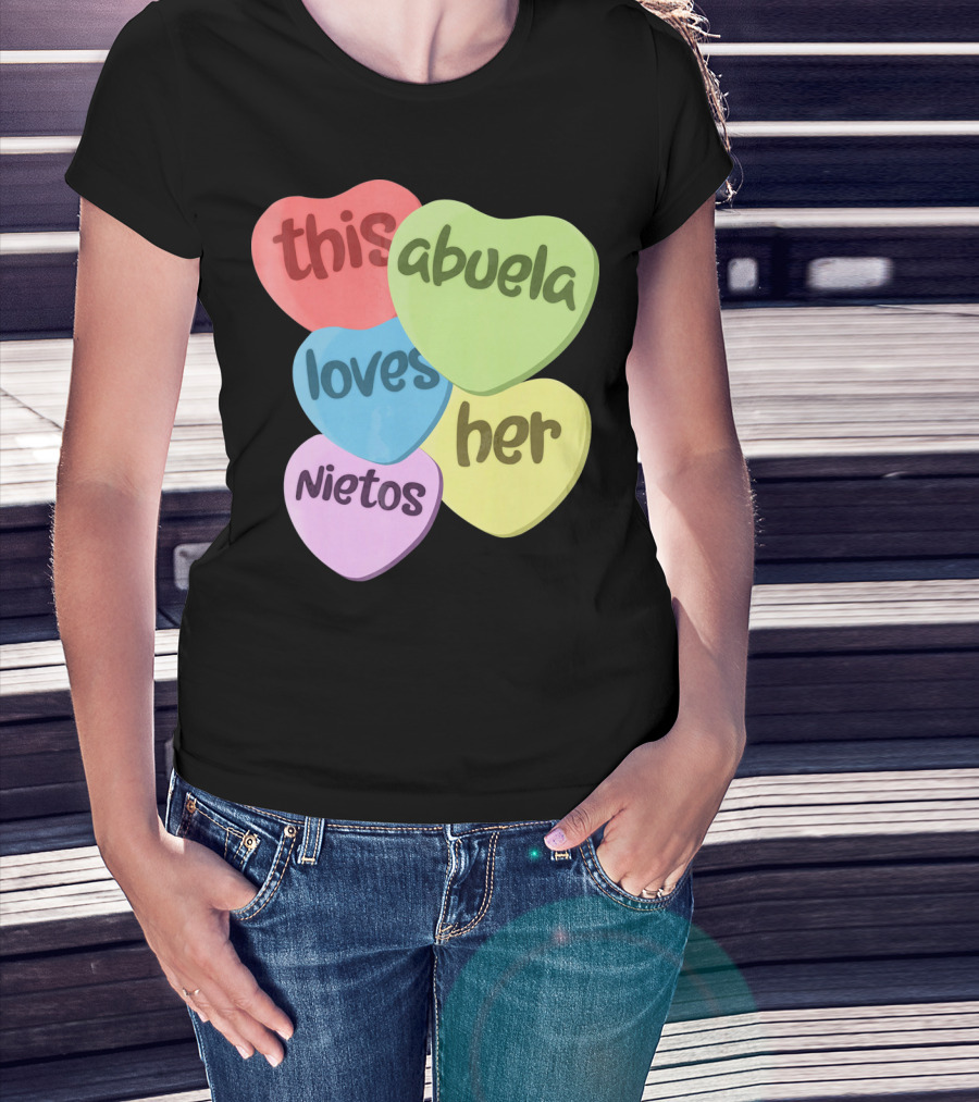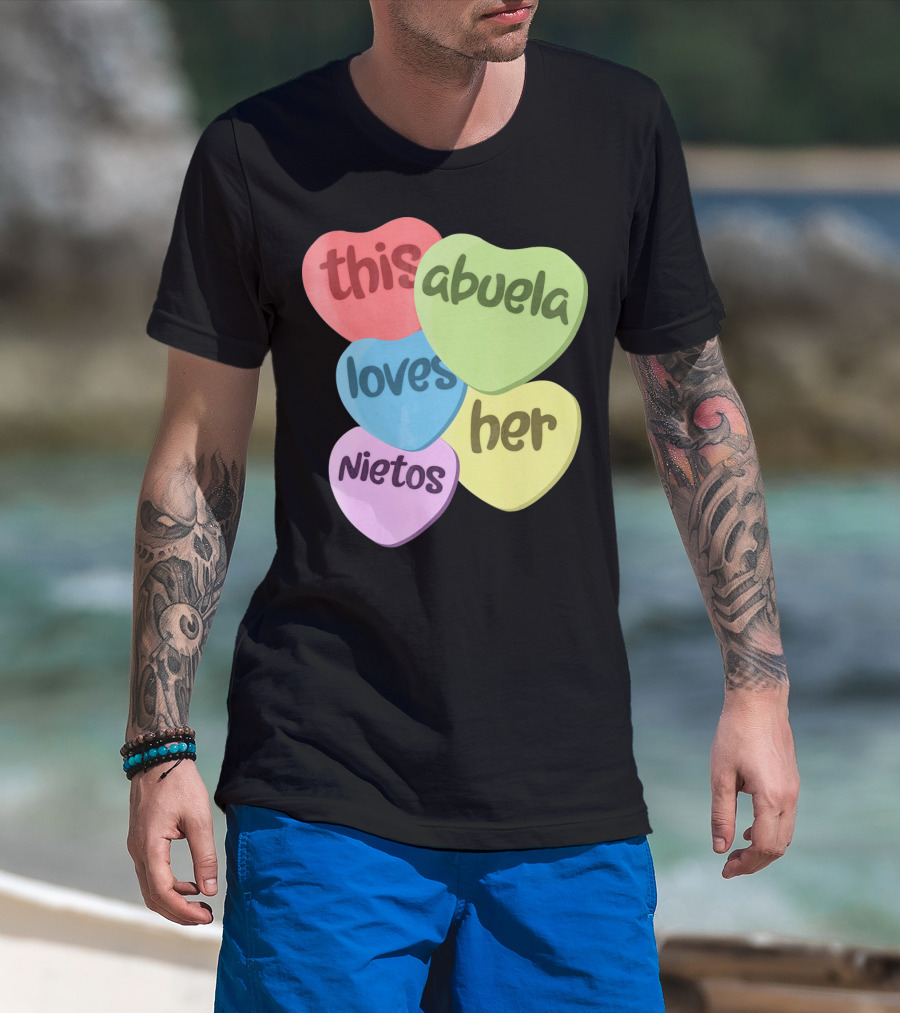 The This Abuela Loves Her Nietos T-shirt is designed for everyday wear and a consistent fit. Fabric is pre-shrunk ring-spun cotton with durable stitching. See the size chart below for exact measurements.