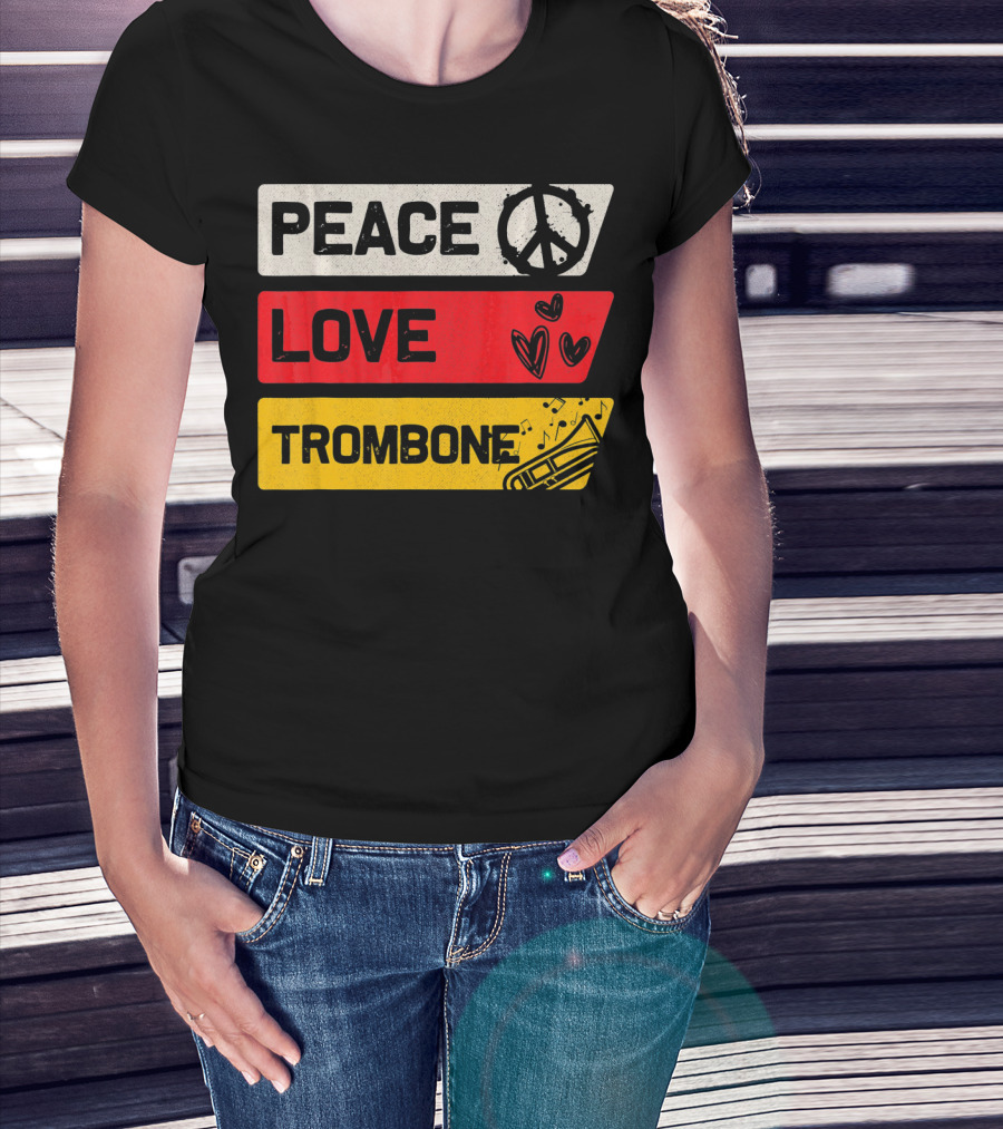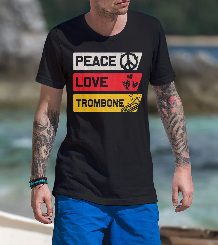 Peace Sign Love Heart Trombone Music Symbols T-Shirt