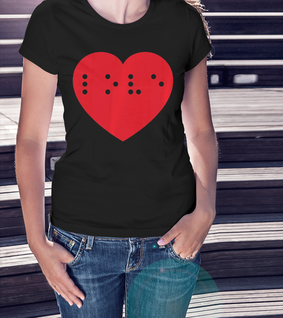 The Love in Braille Inside Big Red Heart T-shirt is designed for everyday wear and a consistent fit. Fabric is pre-shrunk ring-spun cotton with durable stitching. See the size chart below for exact measurements.