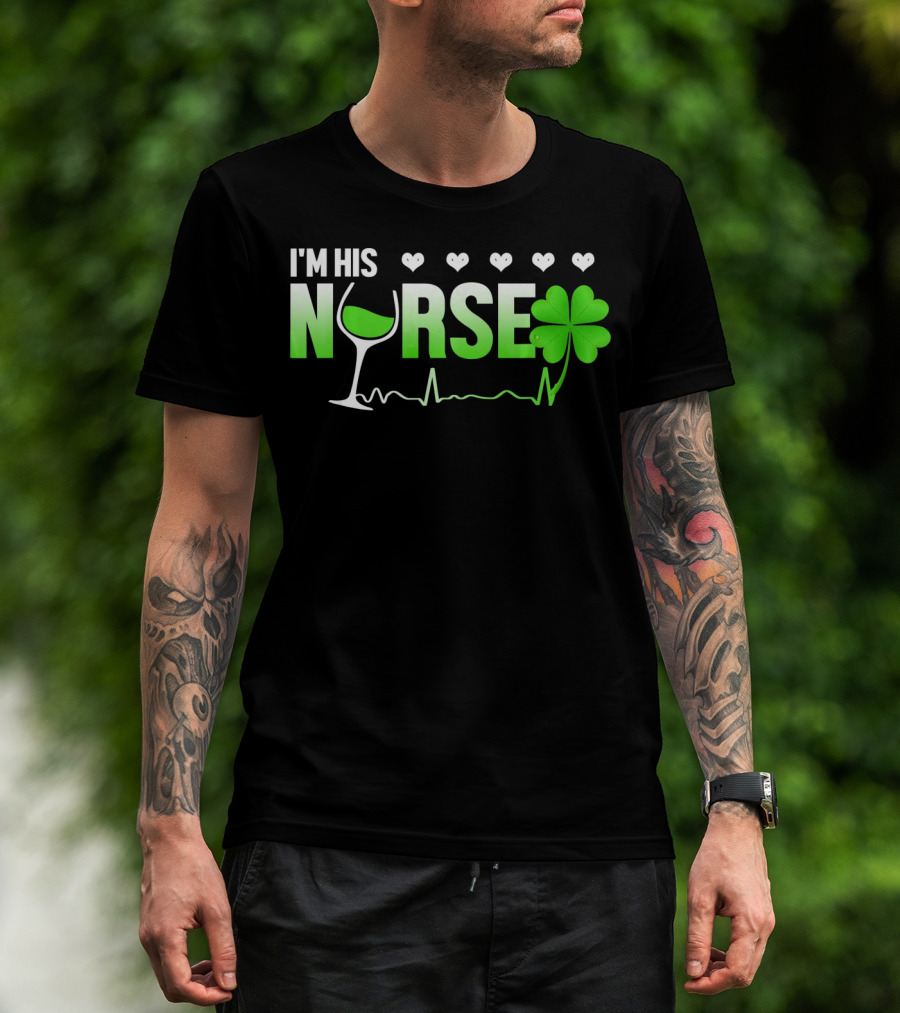 I'm His Nurse Shamrock Wine Glass Heartbeat St Patricks T-Shirt