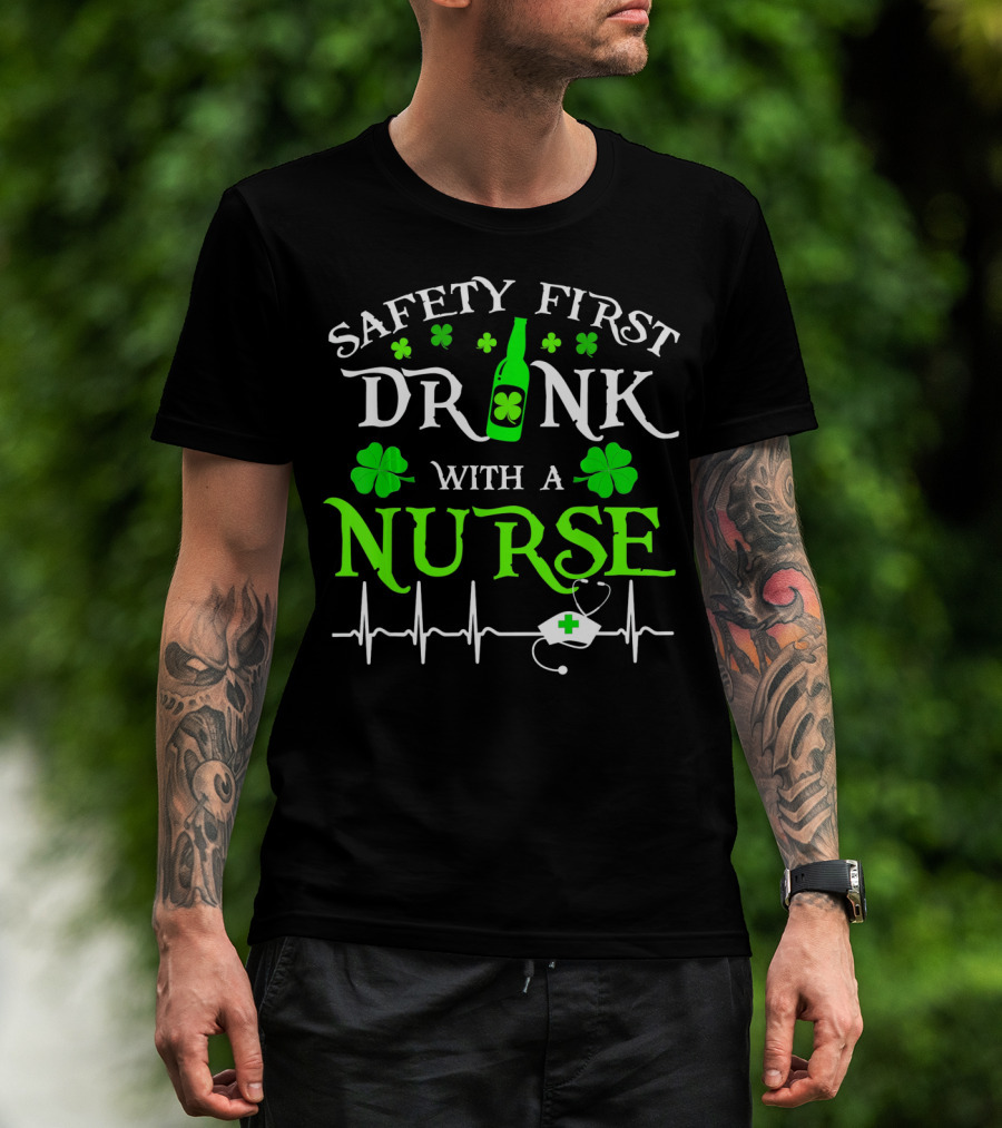 Safety First Drink With A Nurse Shamrocks Beer Bottle Heartbeat T-Shirt