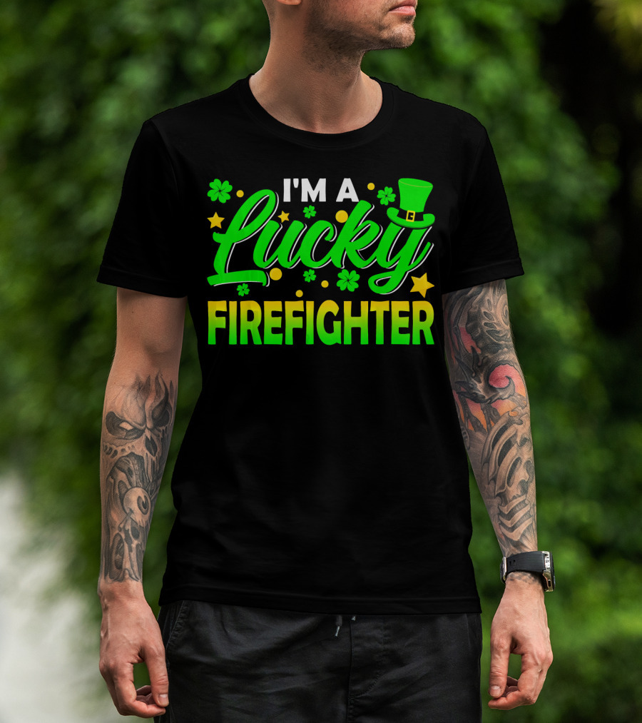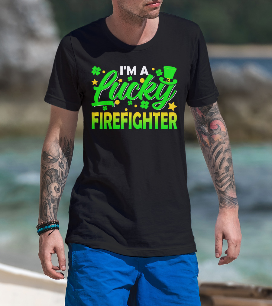 I'm A Lucky Firefighter With Shamrocks And Leprechaun Hat T-Shirt