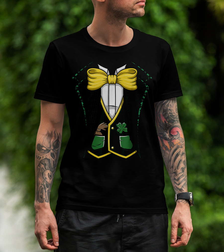 Leprechaun Costume Green Suit With Yellow Bow Tie And Shamrock Details T-Shirt