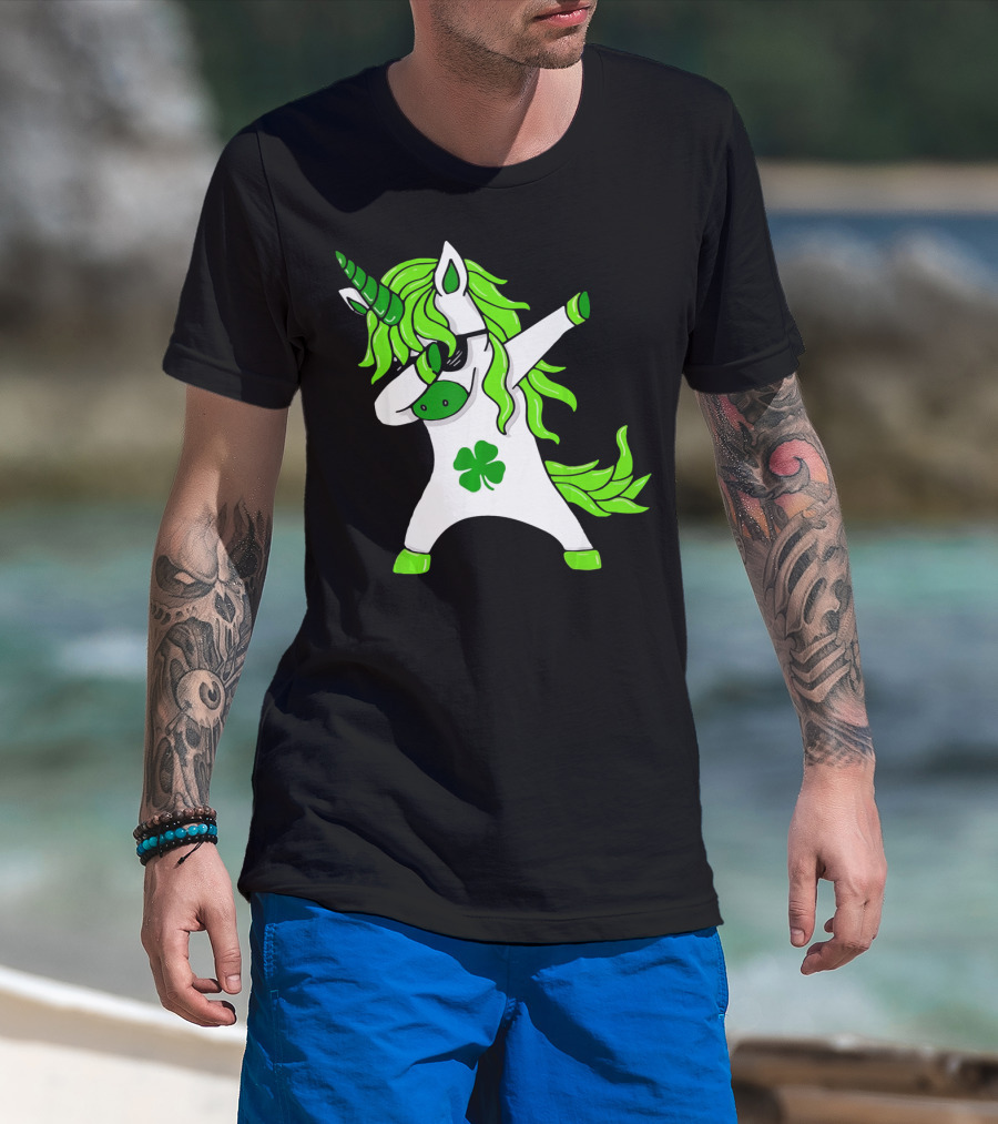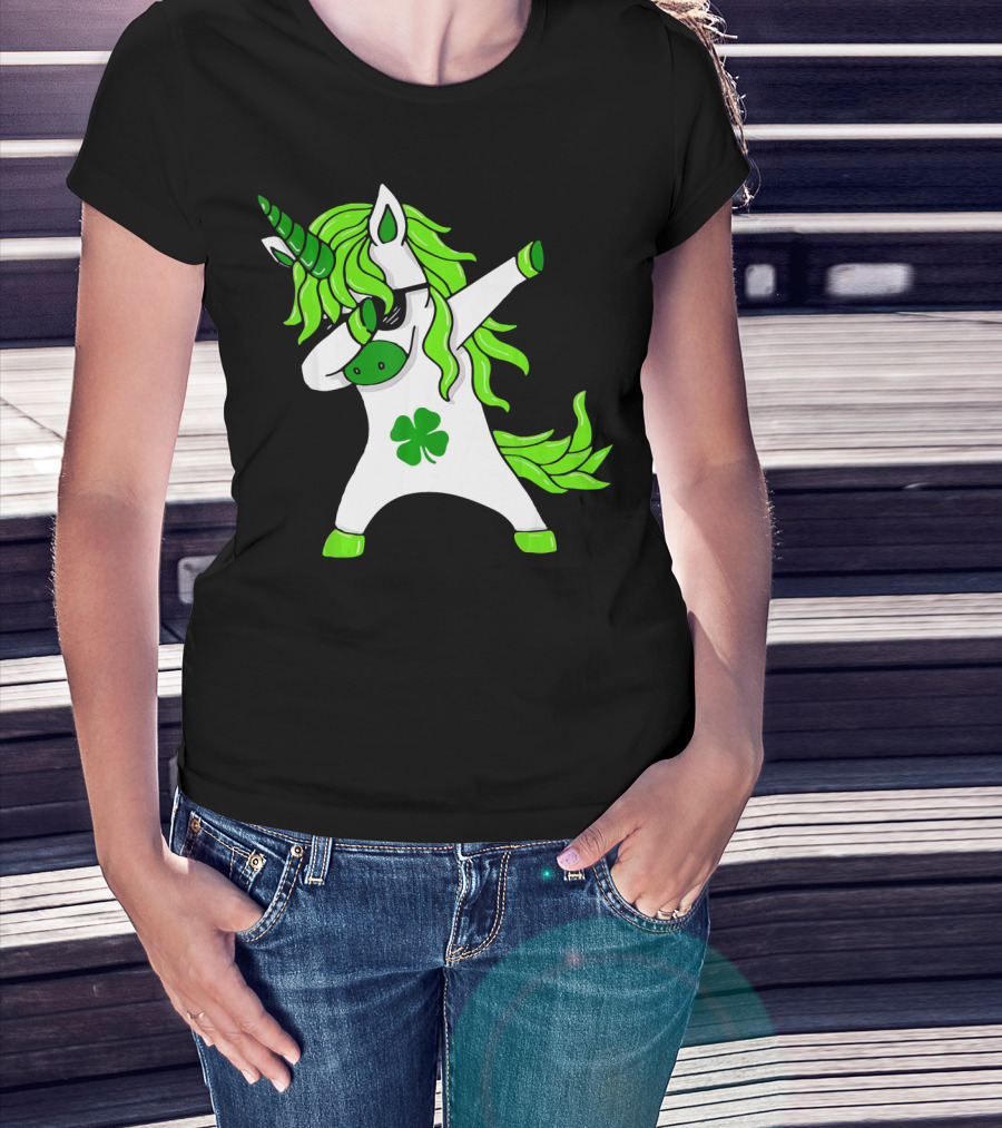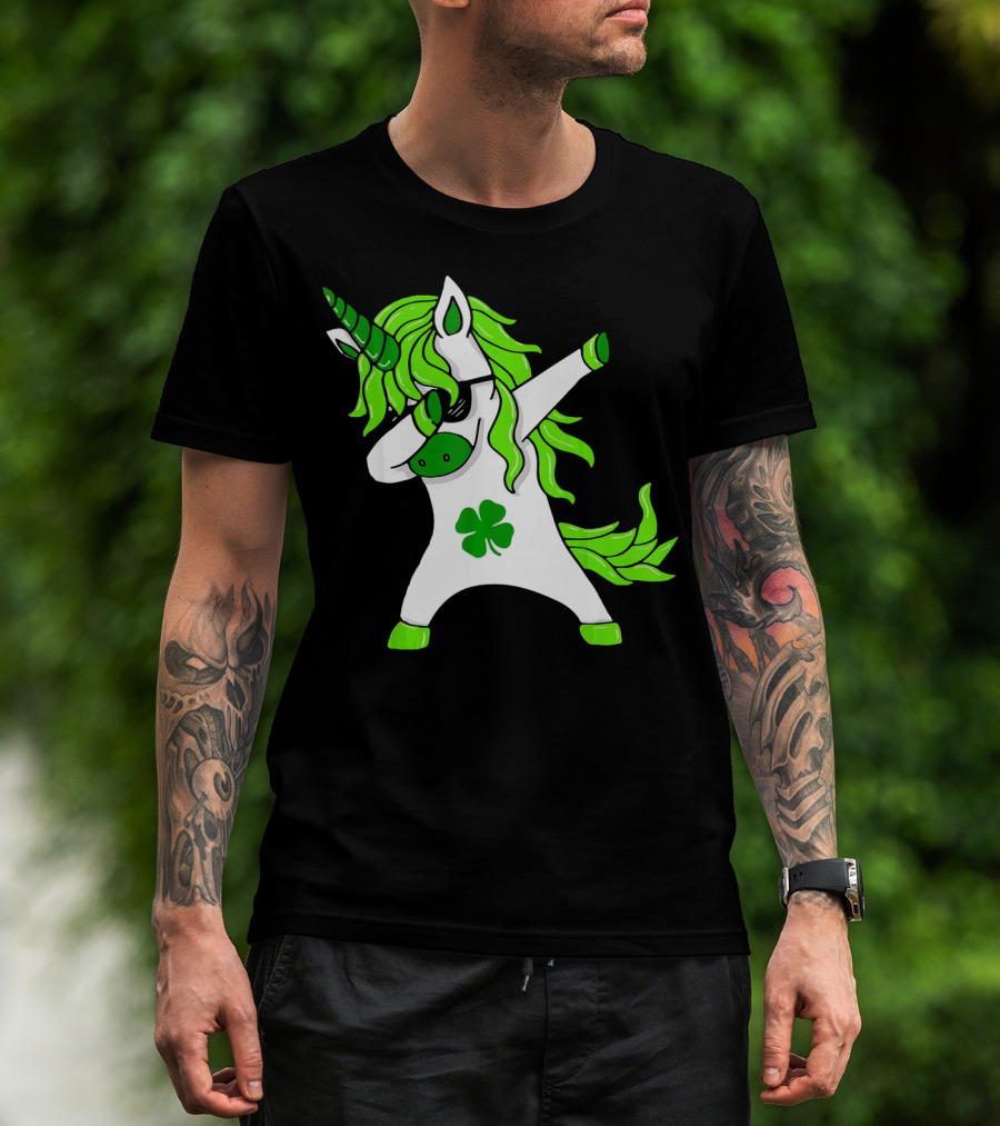 Mens Womens Dabbing Unicorn With Green Shamrock And Hair T-Shirt