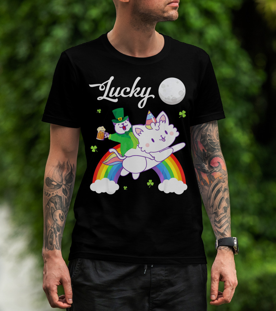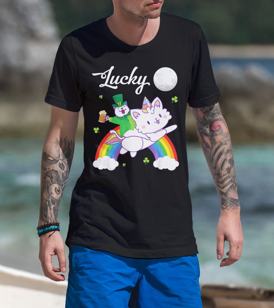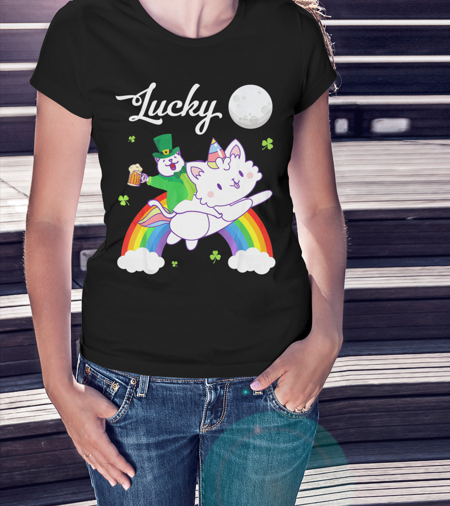 Lucky Leprechaun Cat Riding Unicorn Cat Over Rainbow With Beer And Moon T-Shirt