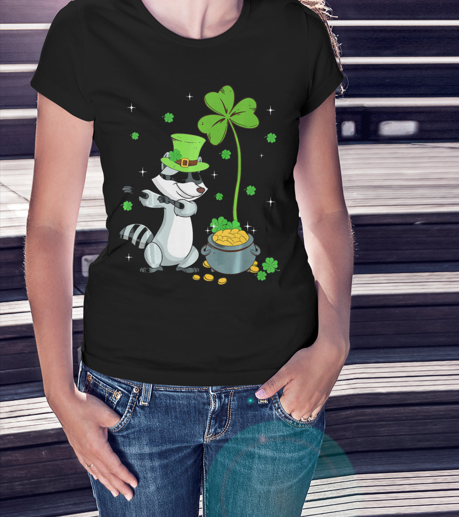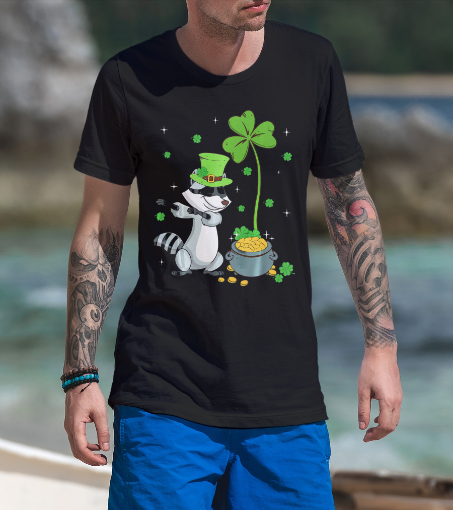 Shamrock Leprechaun Raccoon With Pot Of Gold And Clover St Patricks T-Shirt