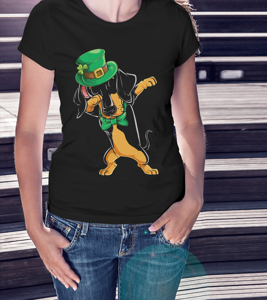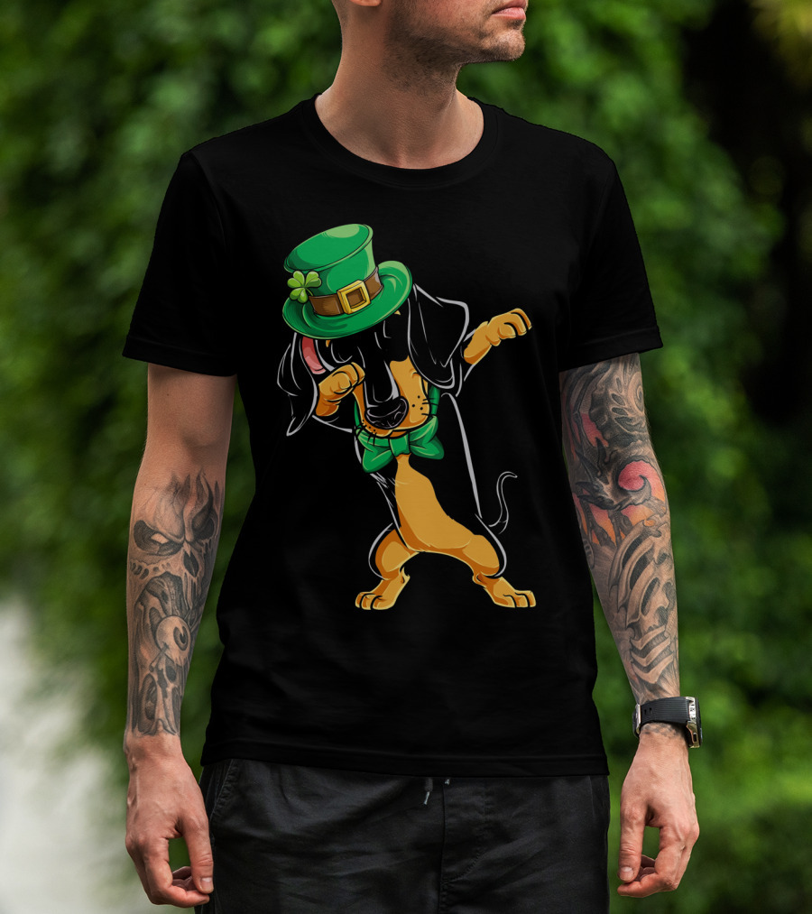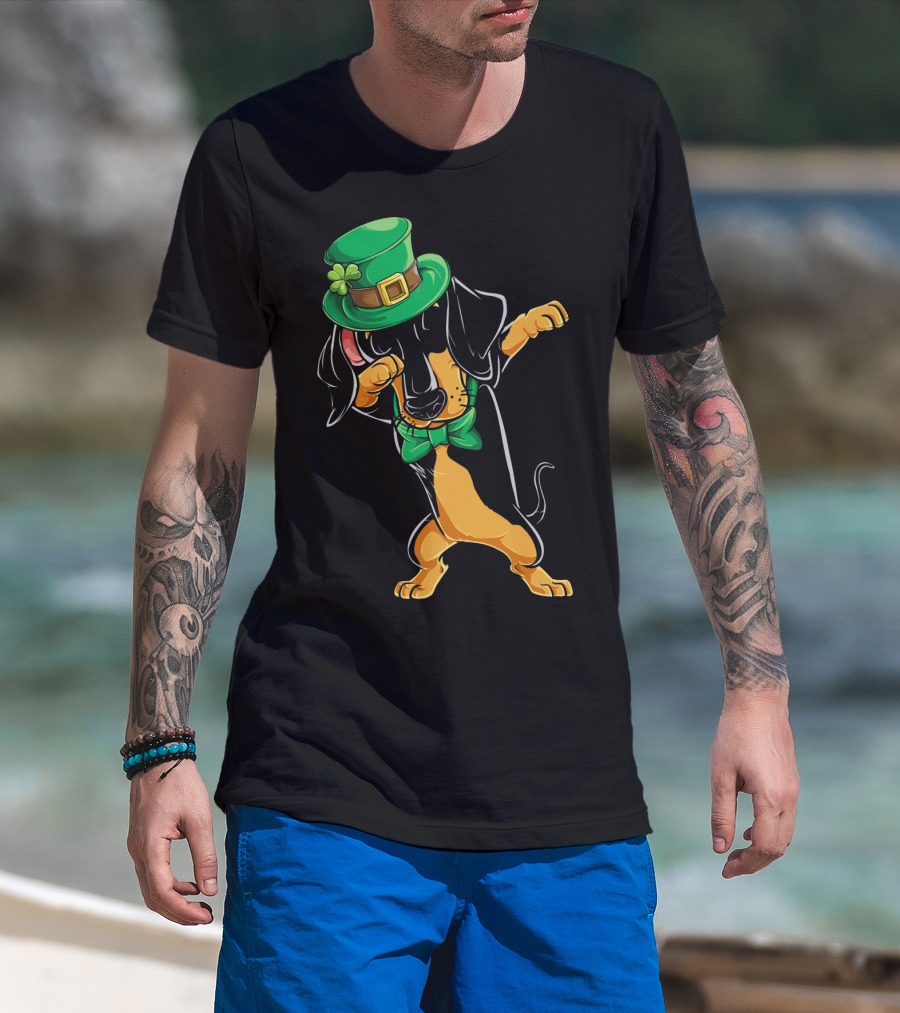 St. Patrick's Day Dabbing Dachshund With Green Hat And Bowtie T-Shirt
