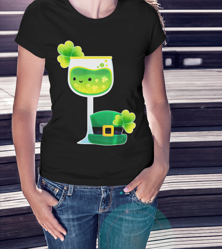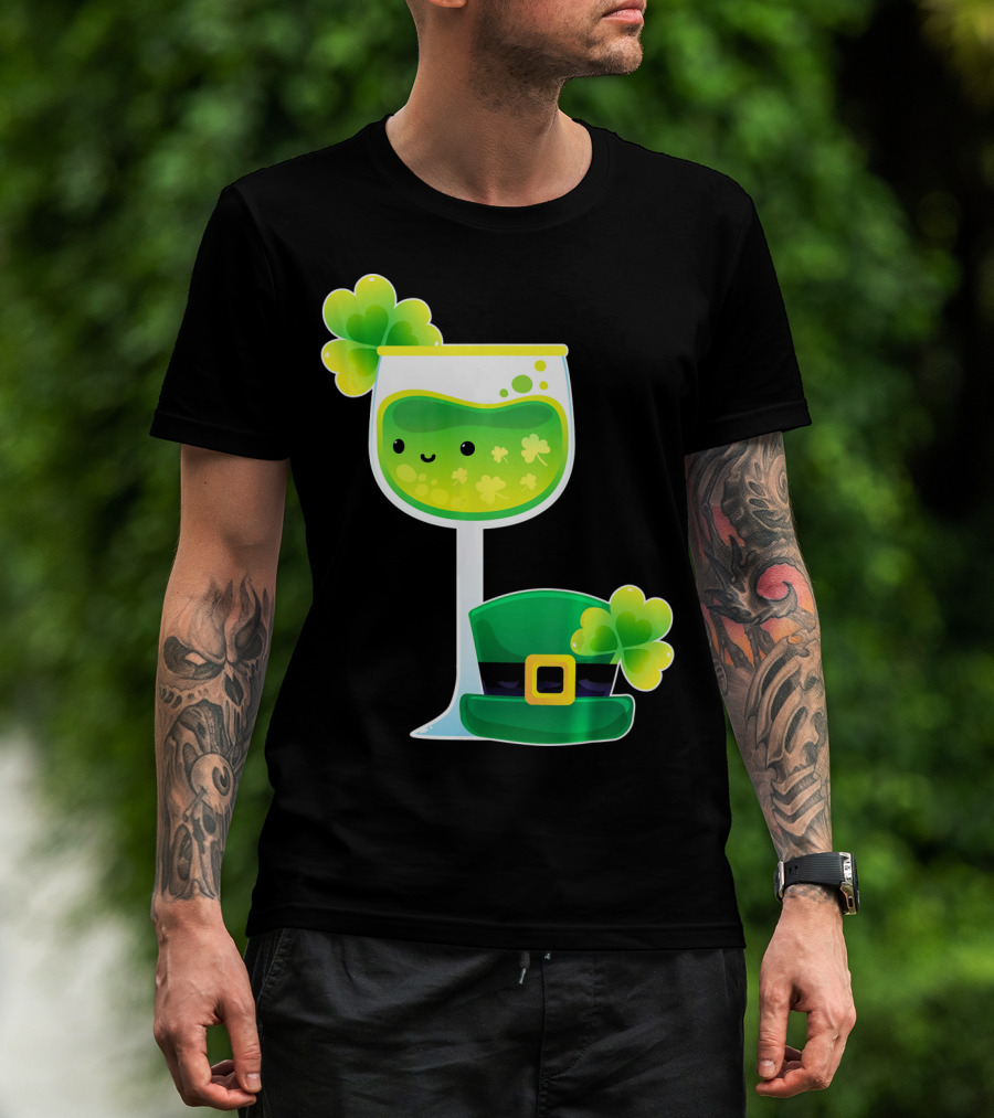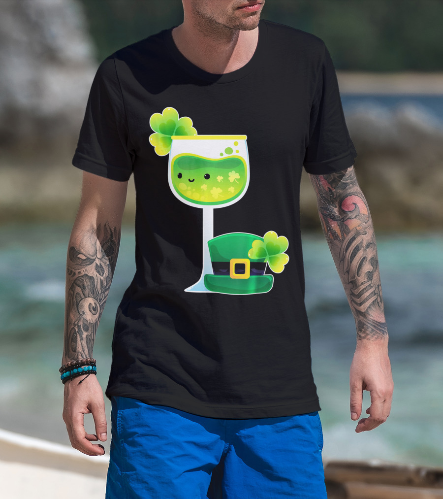 Saint Patrick's Day Green Shamrock Wine Glass With Leprechaun Hat T-Shirt