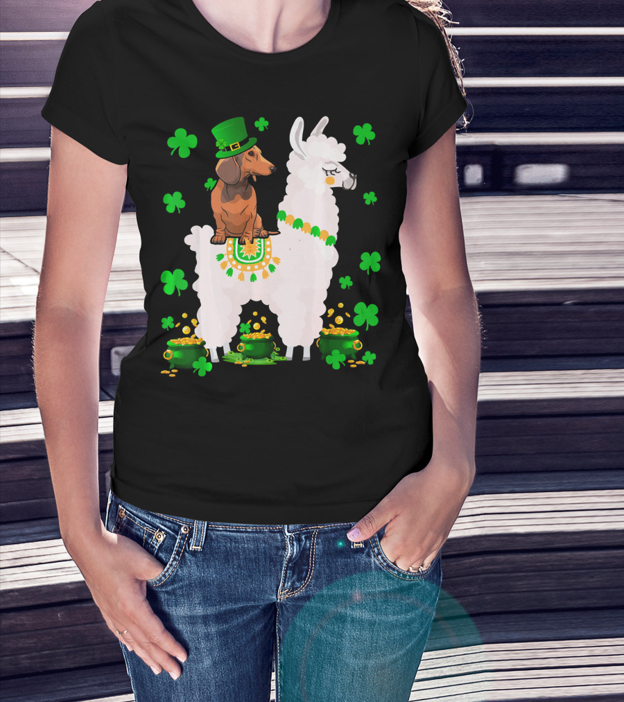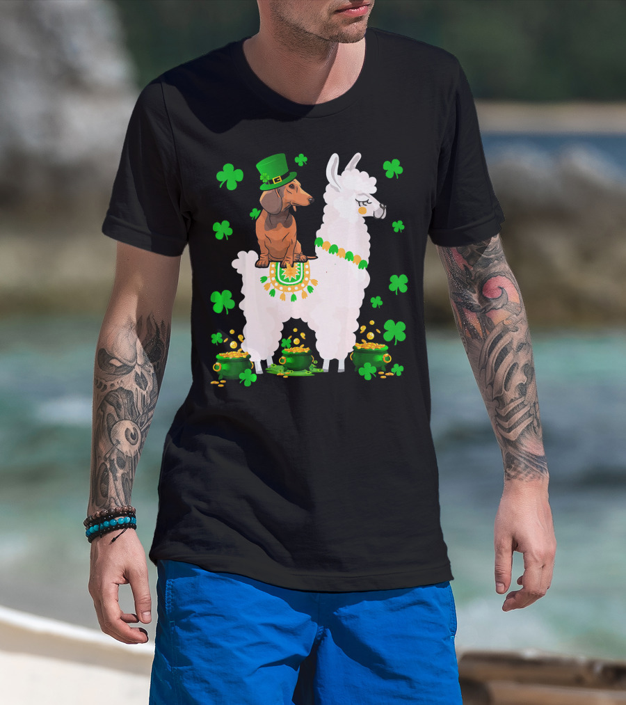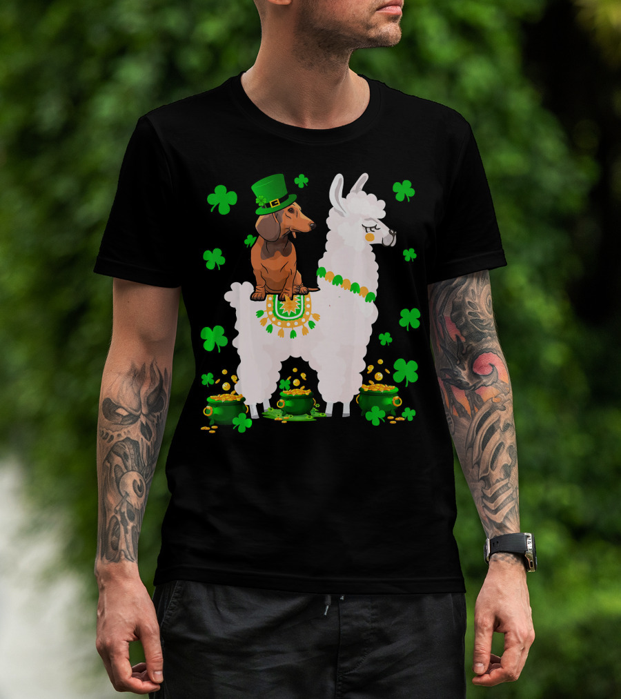 Leprechaun Dachshund Riding Llama Shamrocks Pots Of Gold T-Shirt