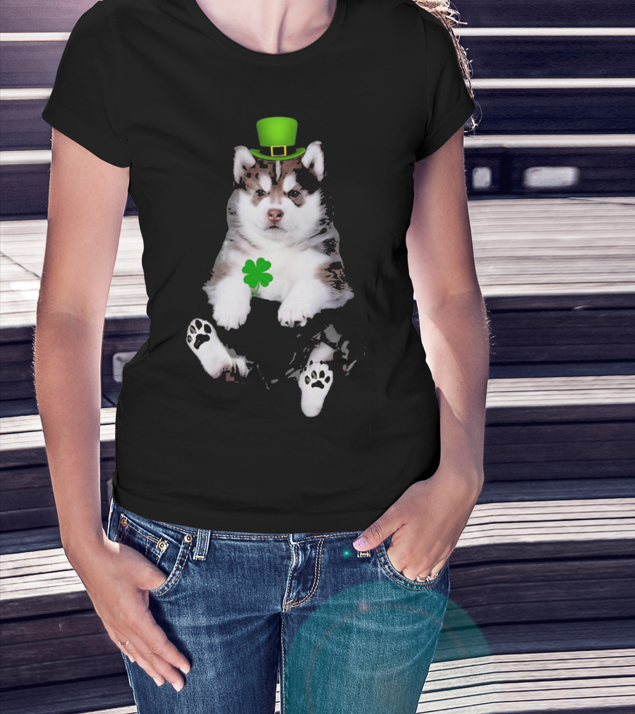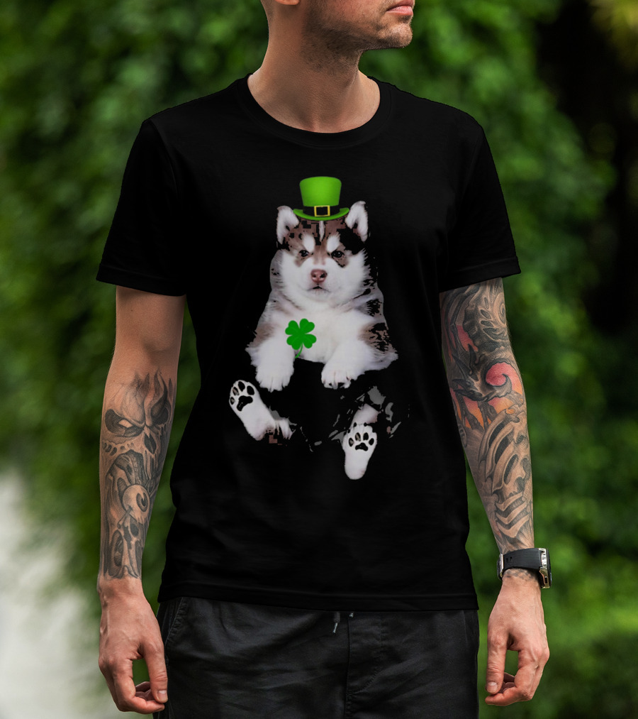 St Patricks Day Husky Puppy Shamrock Hat Paw Prints T-Shirt
