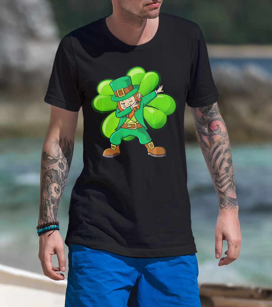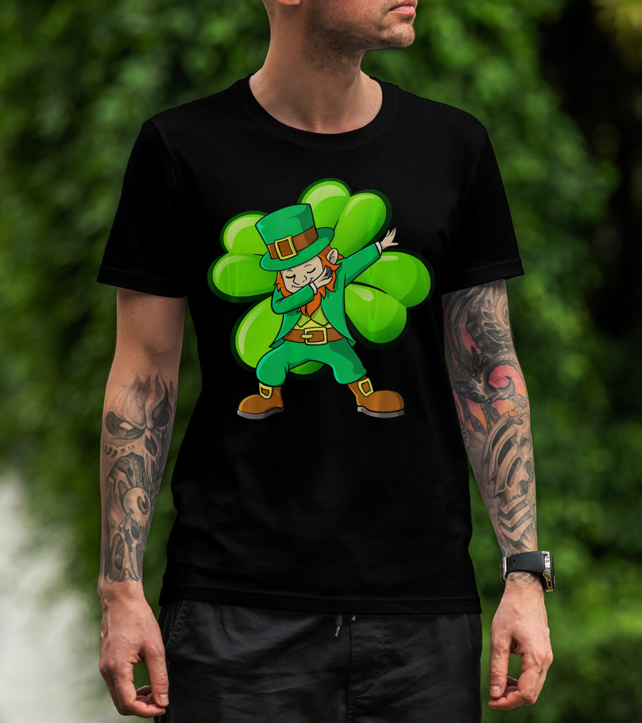 Cute Dabbing Leprechaun With Green Shamrock Background T-Shirt