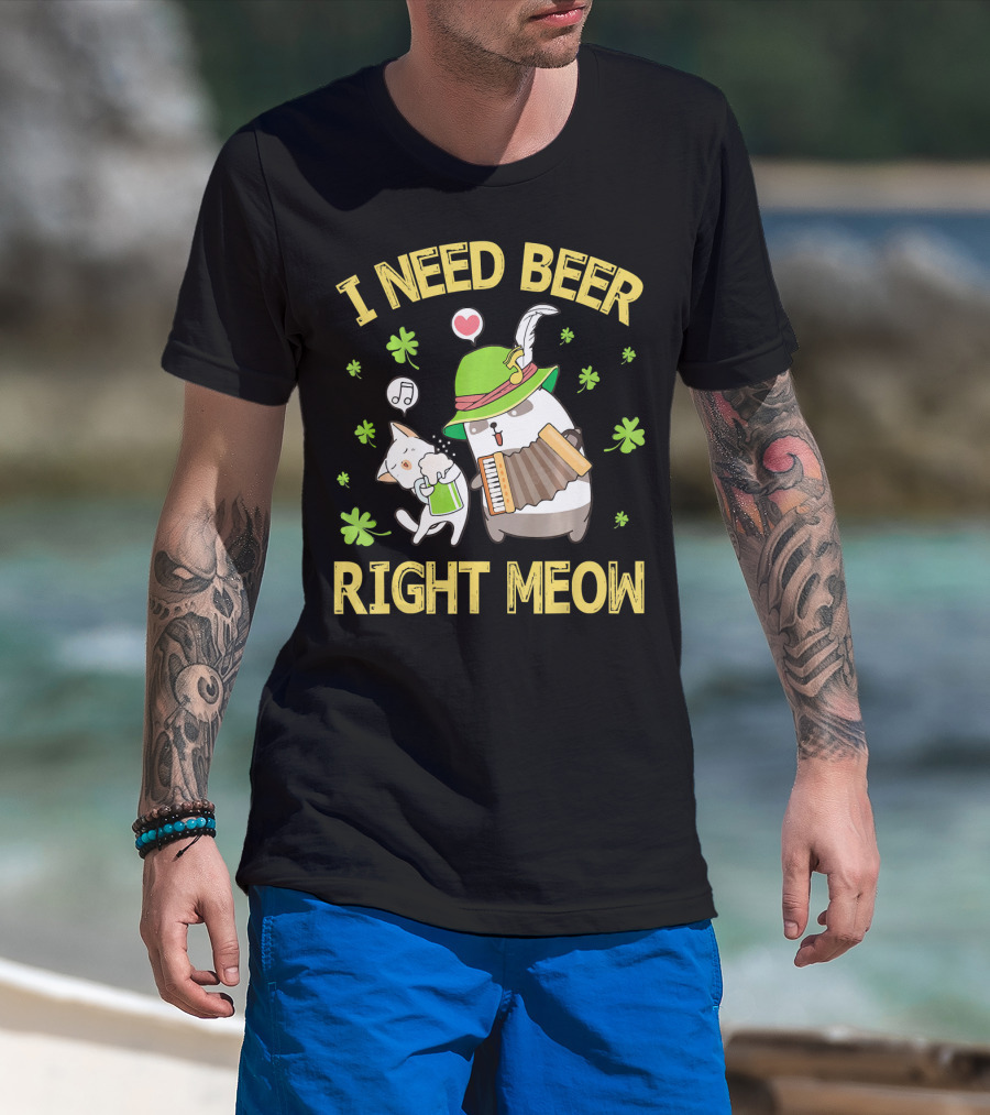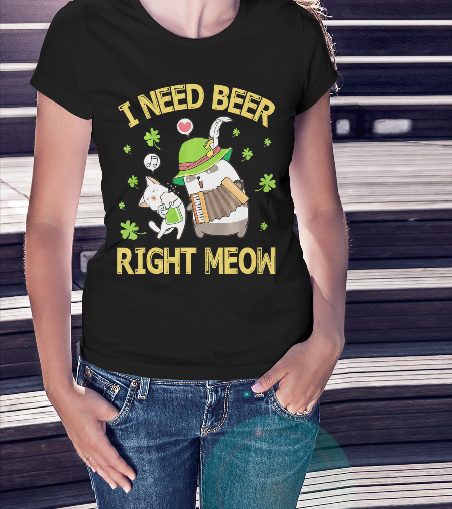 I Need Beer Right Meow Cat And Leprechaun Drinking And Dancing T-Shirt