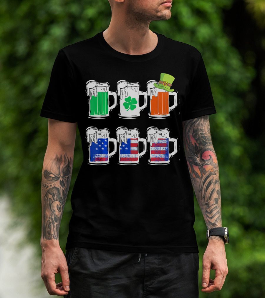 Saint Patricks Irish American Flag Beer Mug With Shamrock And Leprechaun Hat T-Shirt