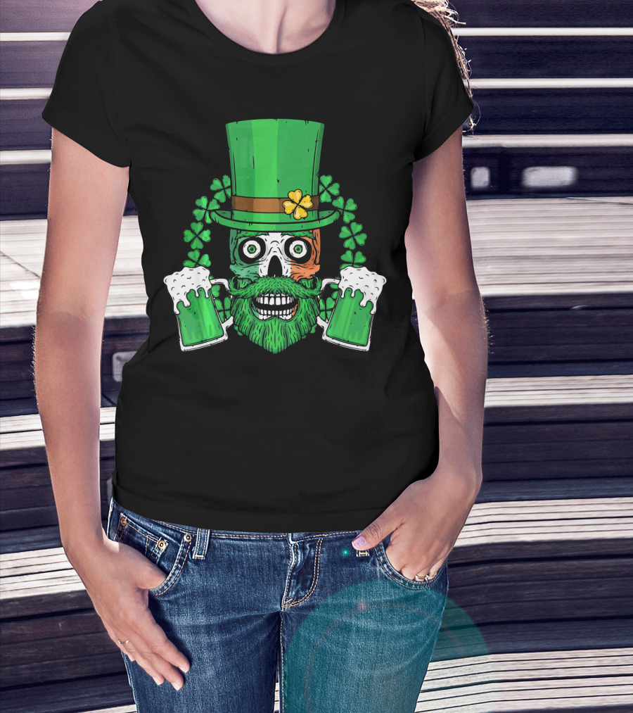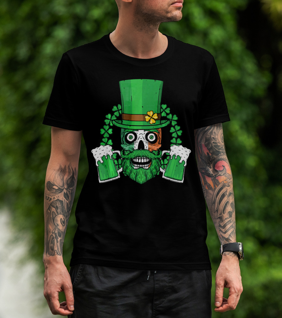 Irish Flag Leprechaun Skull With Shamrock And Beer Mugs T-Shirt