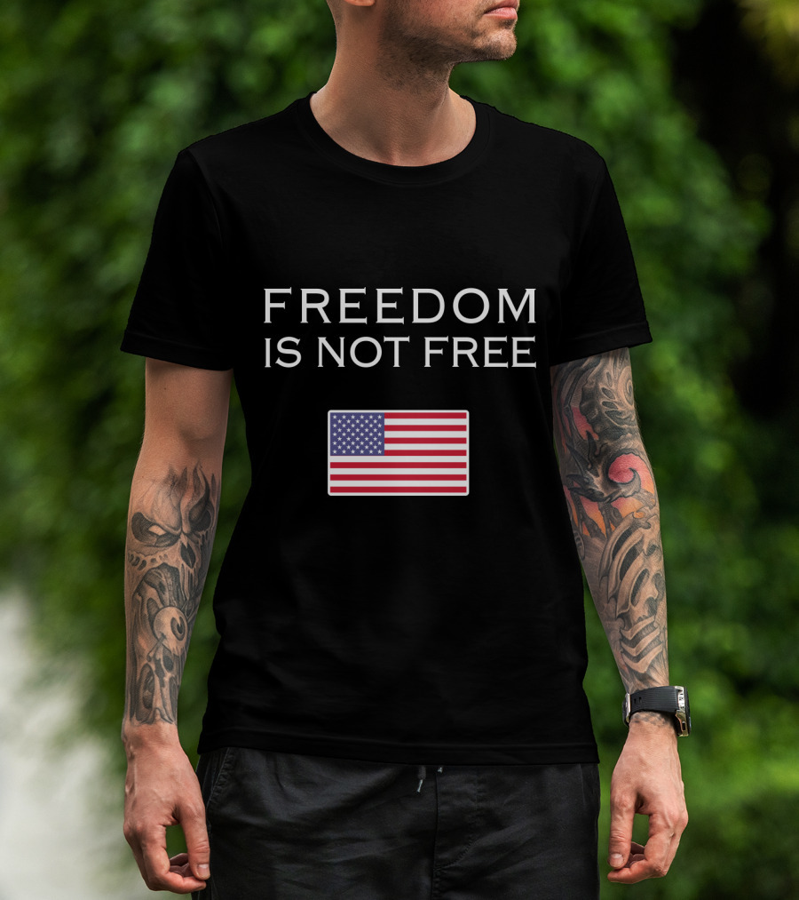 The Freedom Is Not Free American Flag T-shirt is designed for everyday wear and a consistent fit. Fabric is pre-shrunk ring-spun cotton with durable stitching. See the size chart below for exact measurements.