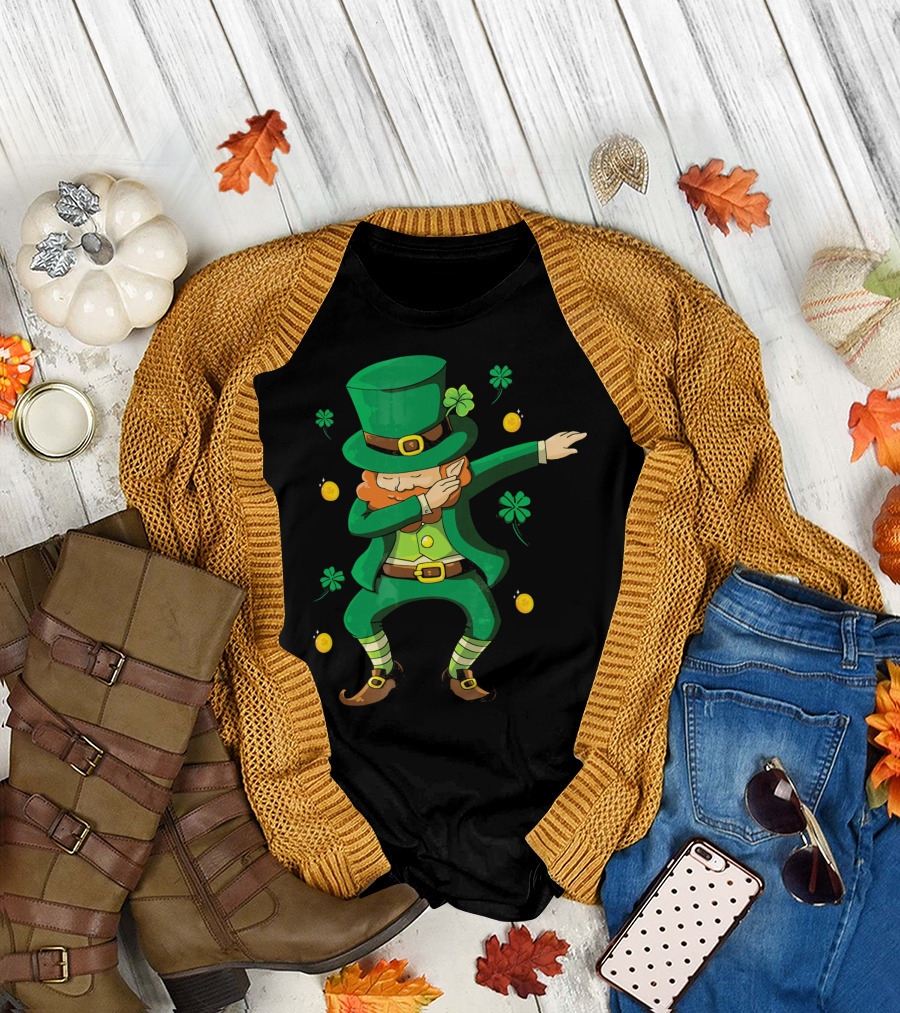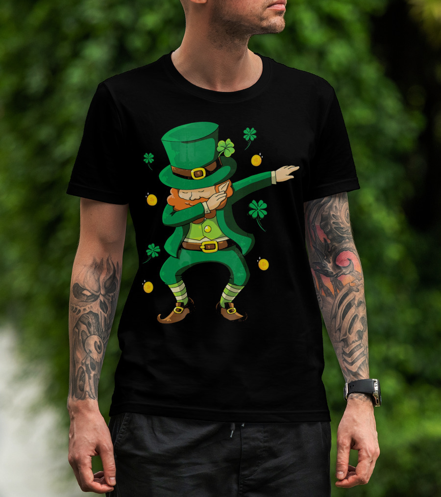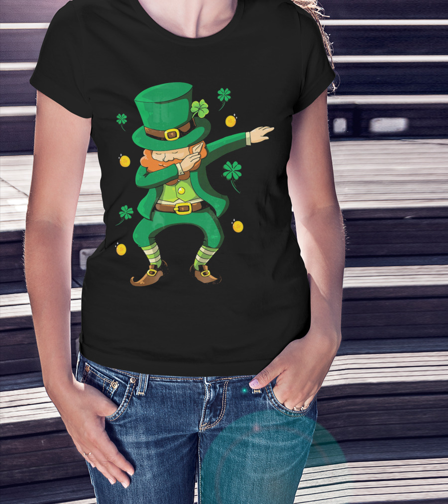 The Funny Leprechaun Dabbing With Clover Coins T-shirt is designed for everyday wear and a consistent fit. Fabric is pre-shrunk ring-spun cotton with durable stitching. See the size chart below for exact measurements.