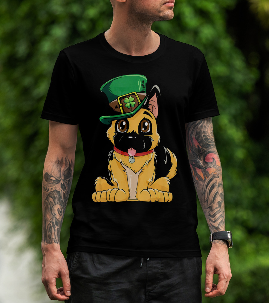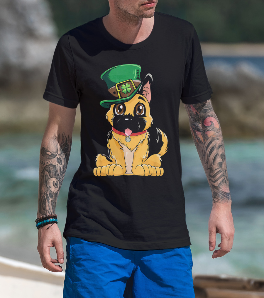 German Shepherd Wearing Leprechaun Hat With Clover T-Shirt