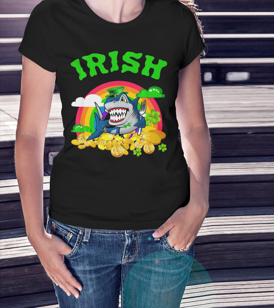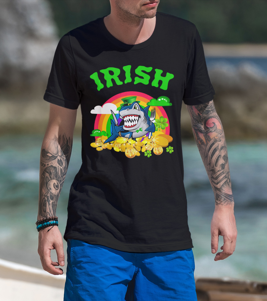 Irish Shark Funny St Patricks Day Leprechaun Rainbow Coins T-Shirt