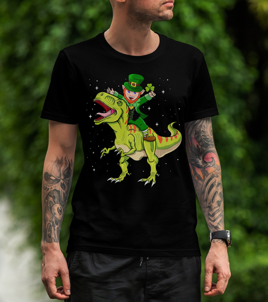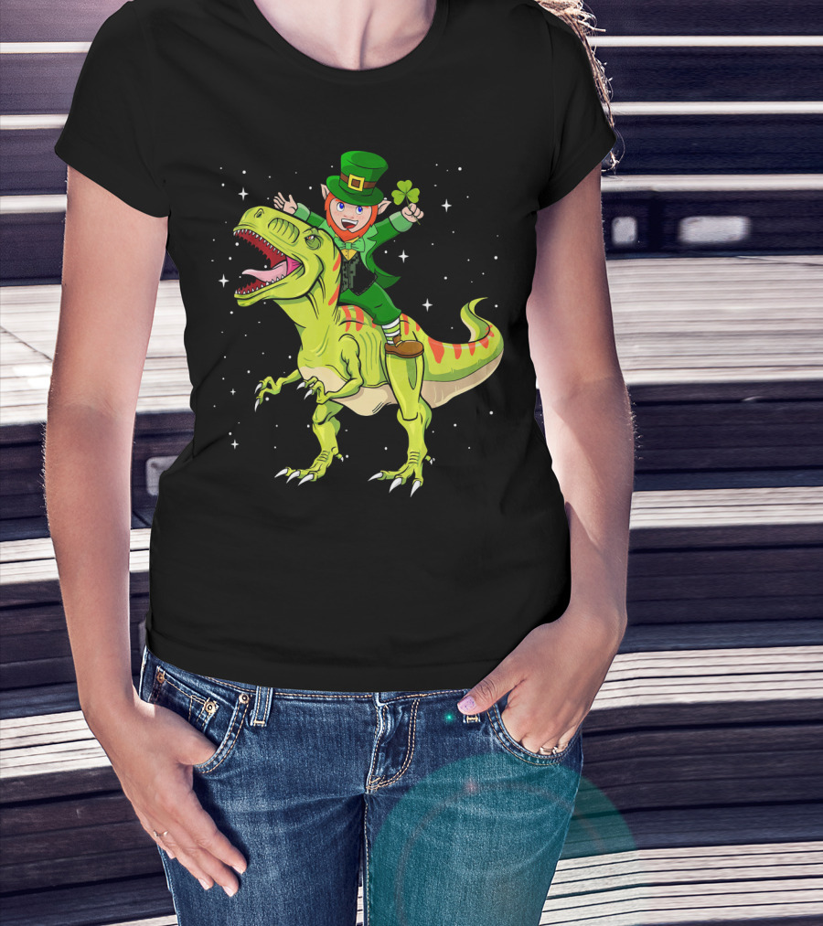 St Patricks Day Leprechaun Riding T Rex Dinosaur With Shamrock T-Shirt