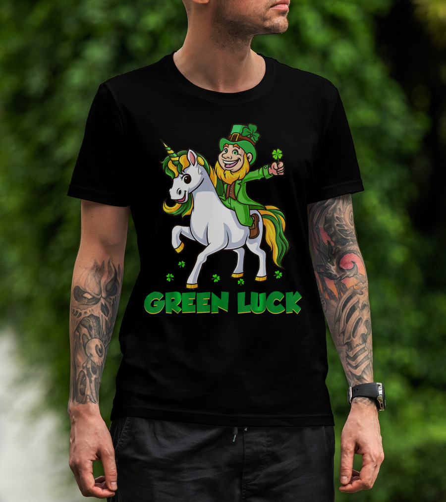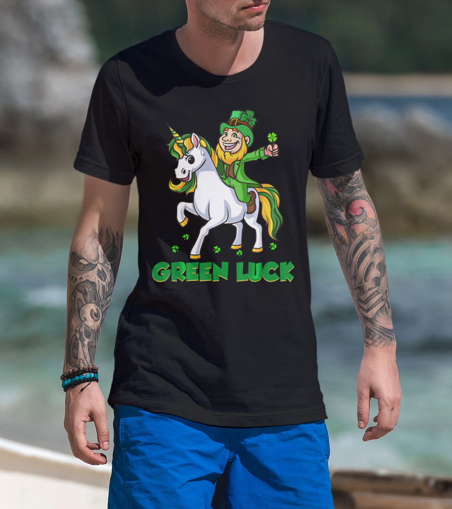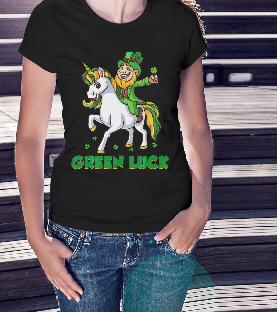 Green Luck Leprechaun Holding Shamrock Riding Unicorn T-Shirt