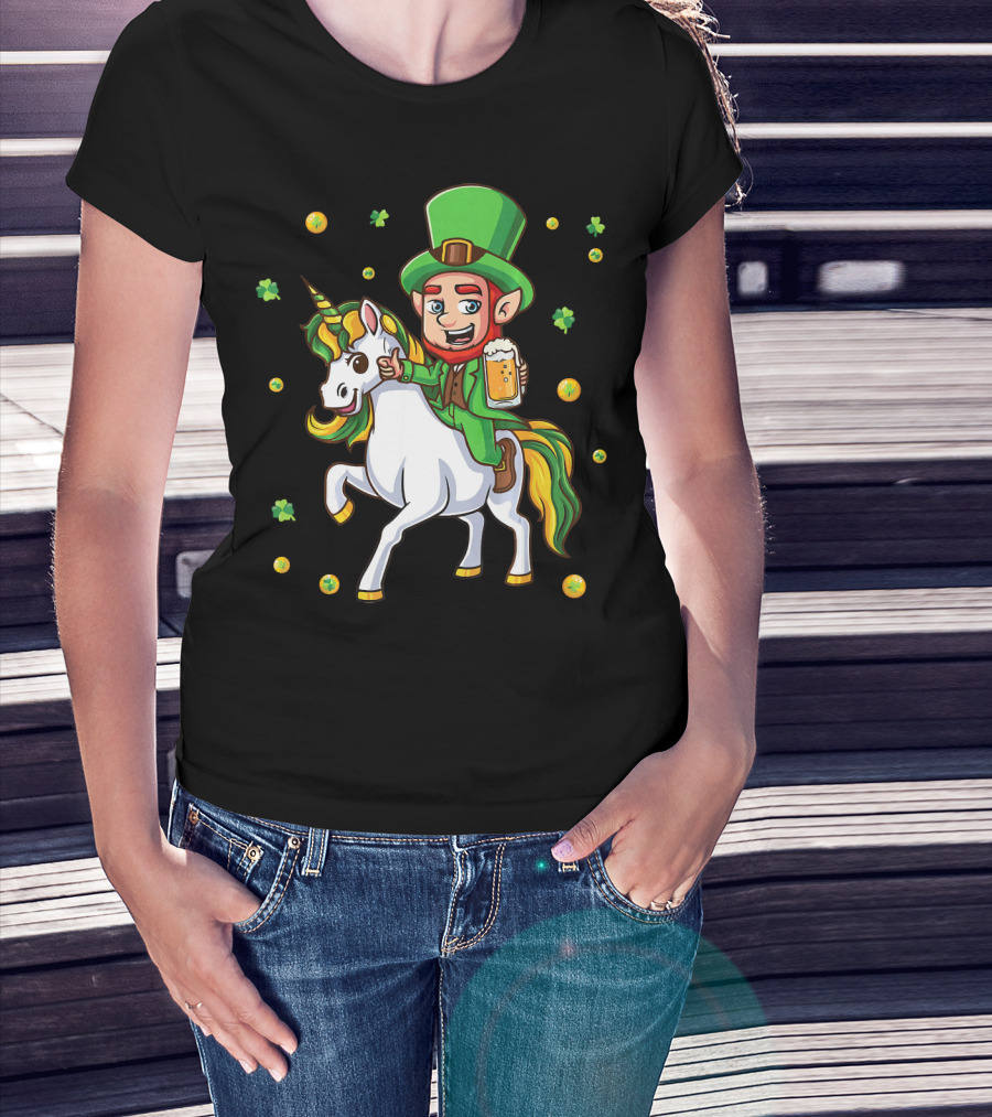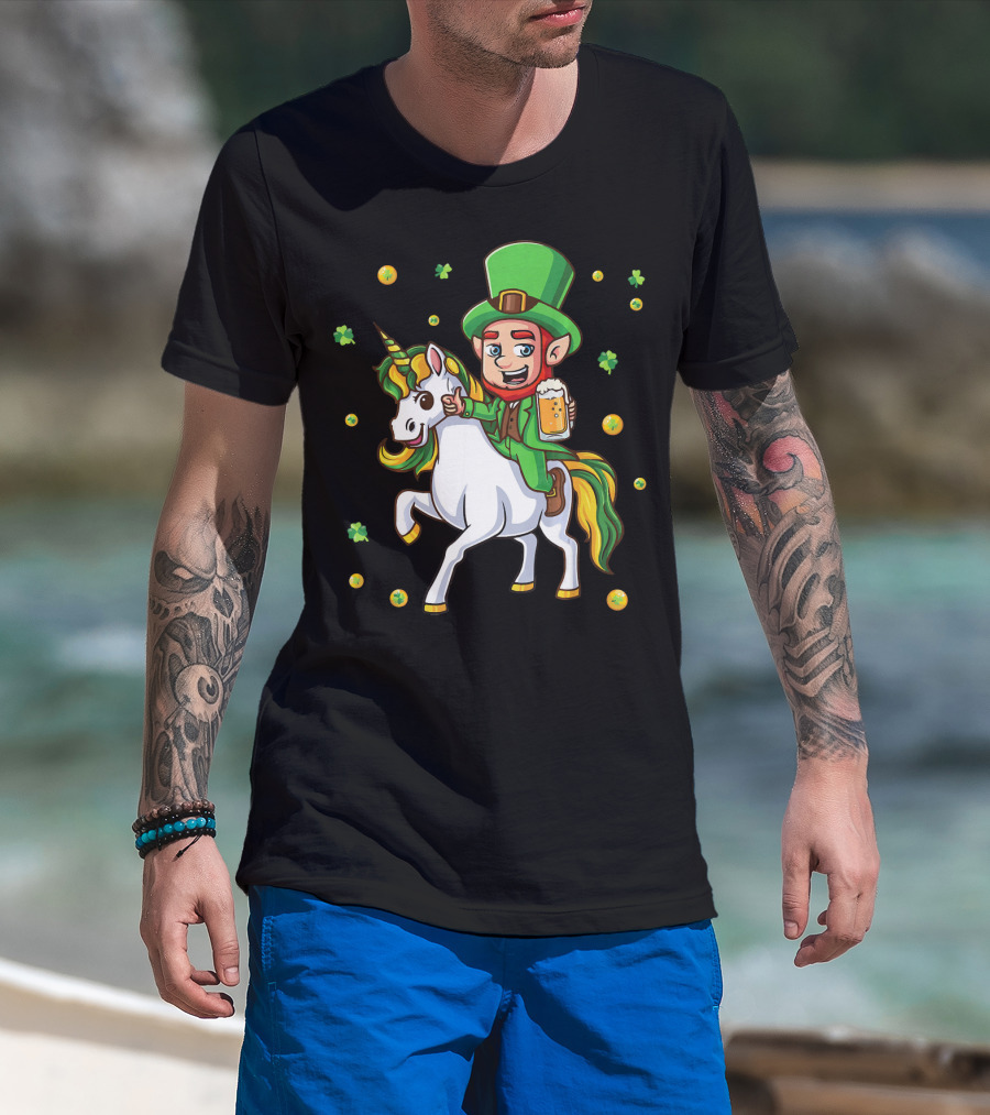 Leprechaun Drinking Beer With Unicorn Surrounded By Clovers And Coins T-Shirt