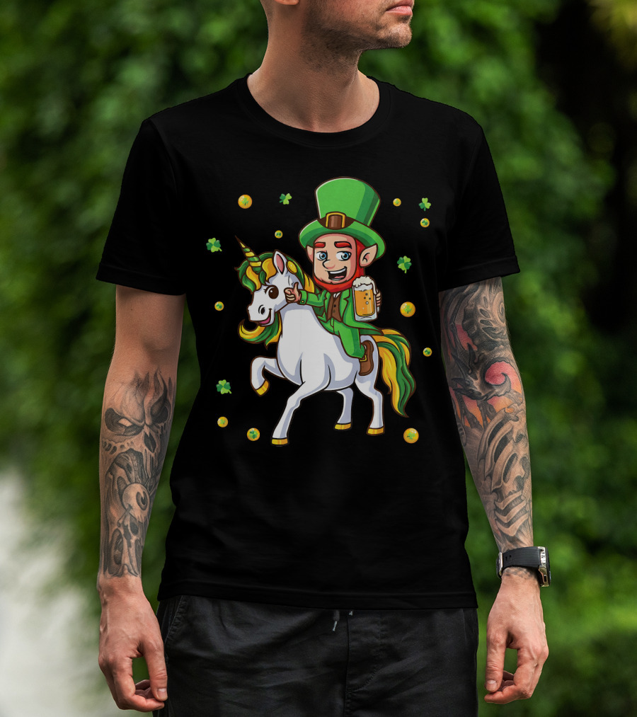 The Leprechaun Drinking Beer with Unicorn Surrounded by Clovers and Coins T-shirt is designed for everyday wear and a consistent fit. Fabric is pre-shrunk ring-spun cotton with durable stitching. See the size chart below for exact measurements.