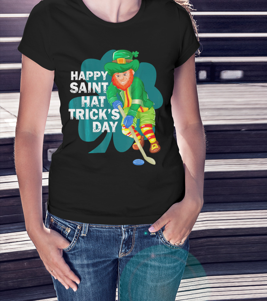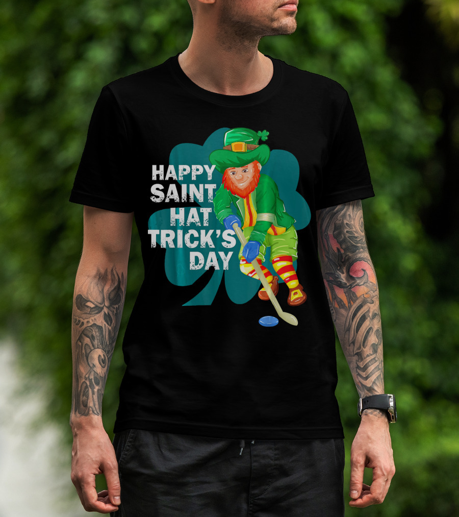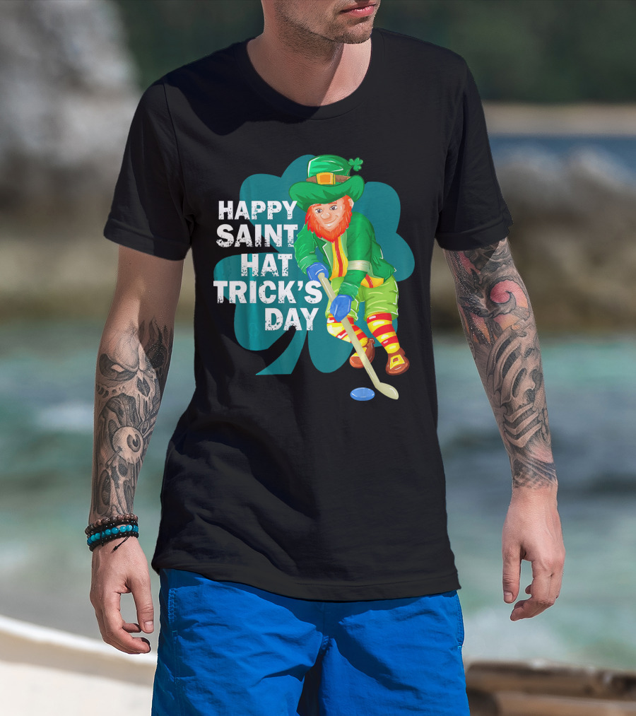 The Happy Saint Hat Trick's Day Leprechaun Hockey Player Shamrock Ice T-shirt is designed for everyday wear and a consistent fit. Fabric is pre-shrunk ring-spun cotton with durable stitching. See the size chart below for exact measurements.