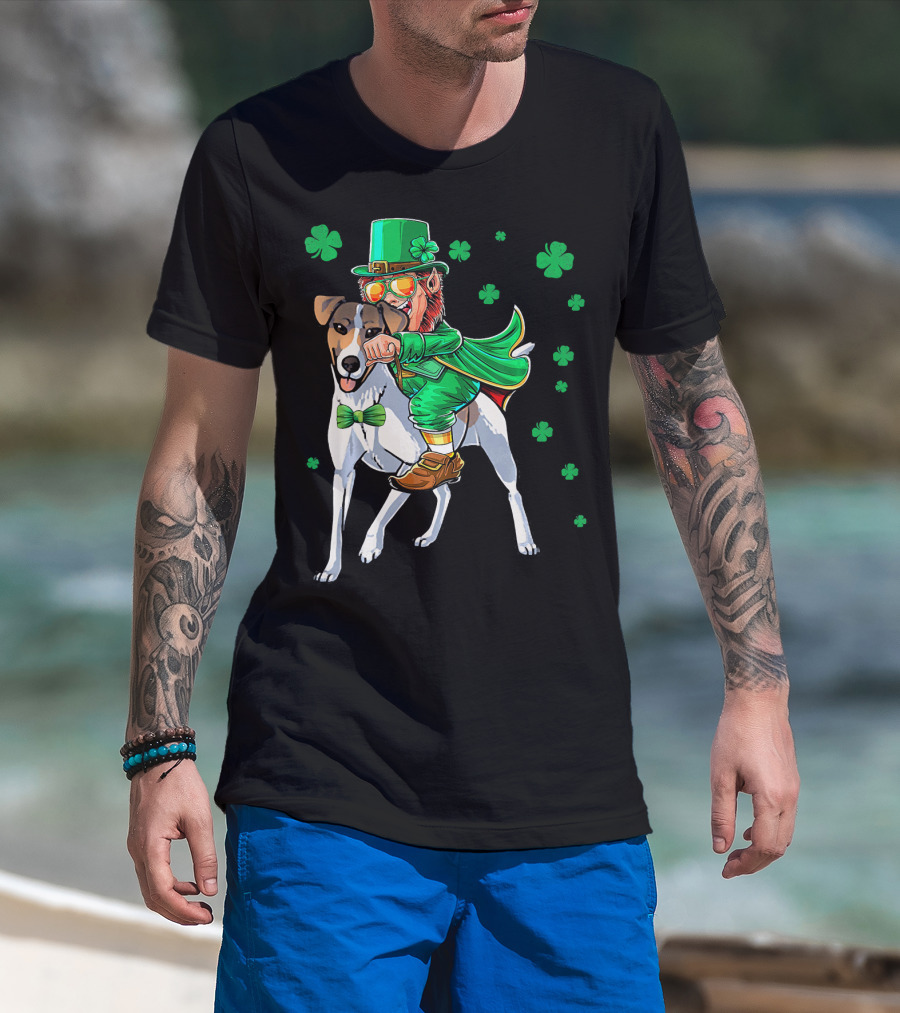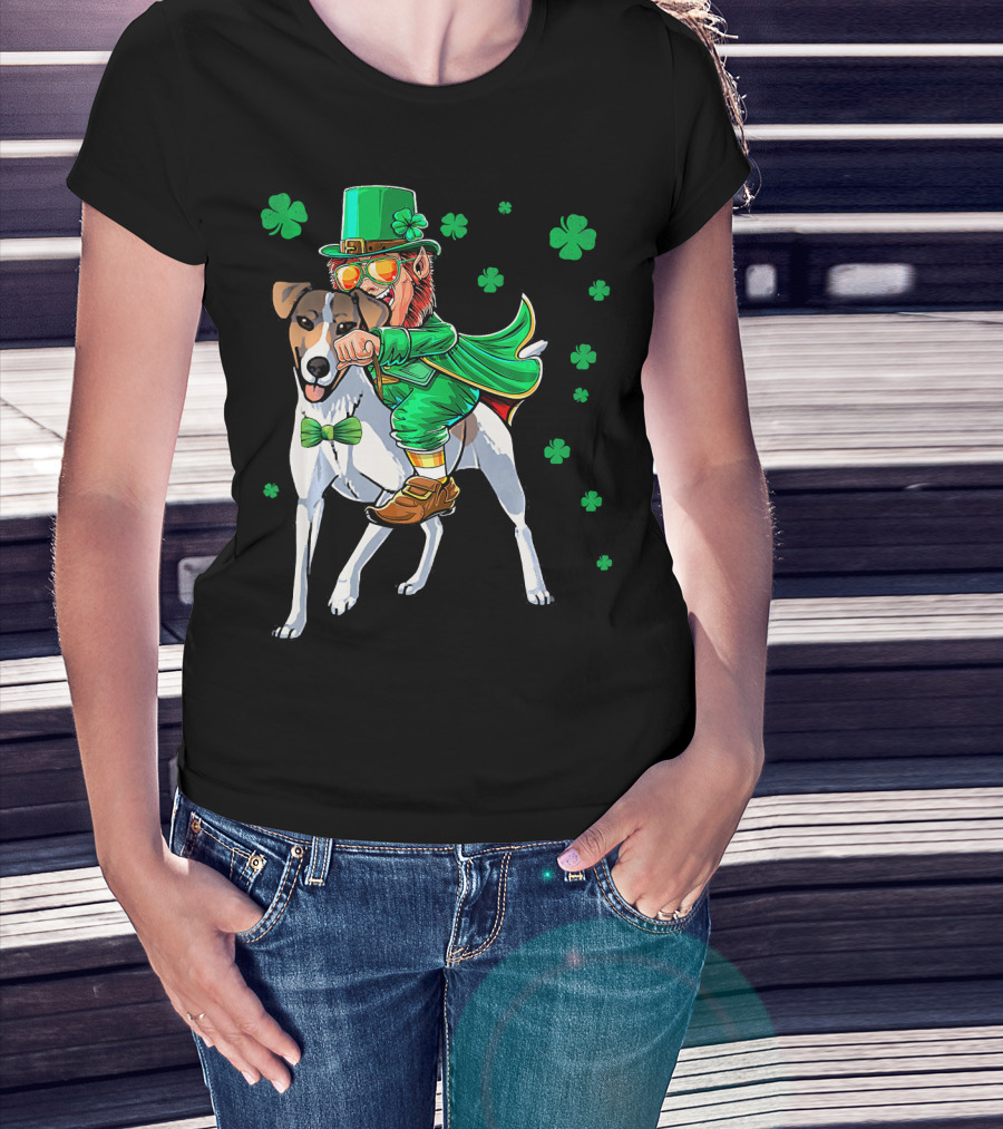 Leprechaun Riding Smooth Fox Terrier With Shamrocks T-Shirt