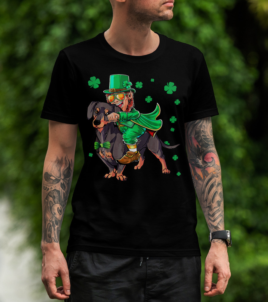Leprechaun Riding Miniature Dachshund With Shamrocks T-Shirt