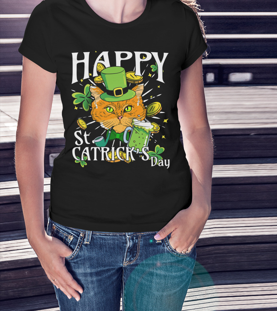Happy St. Catricks Day Funny St. Patrick Cat Clover Coins T-Shirt