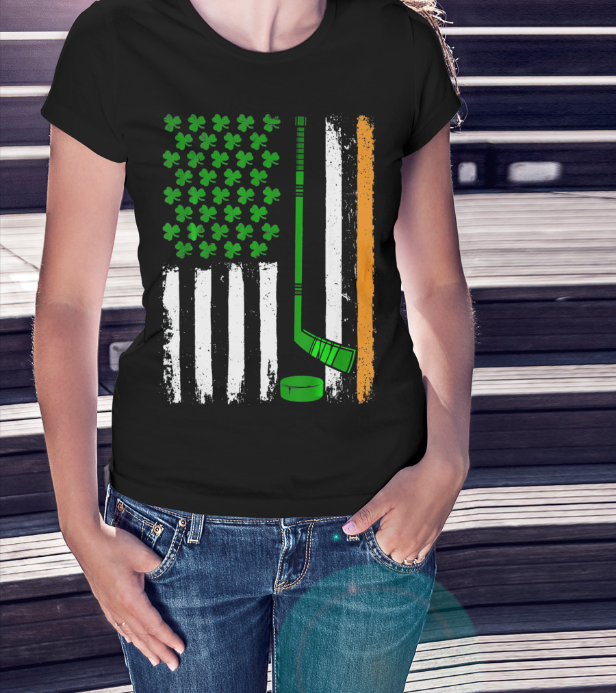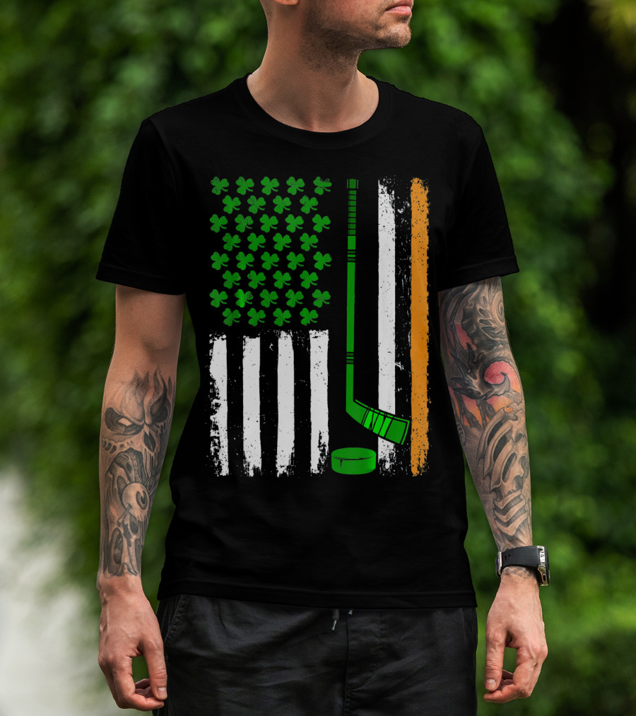 Hockey St Patricks Irish American Flag Shamrock Hockey Stick T-Shirt