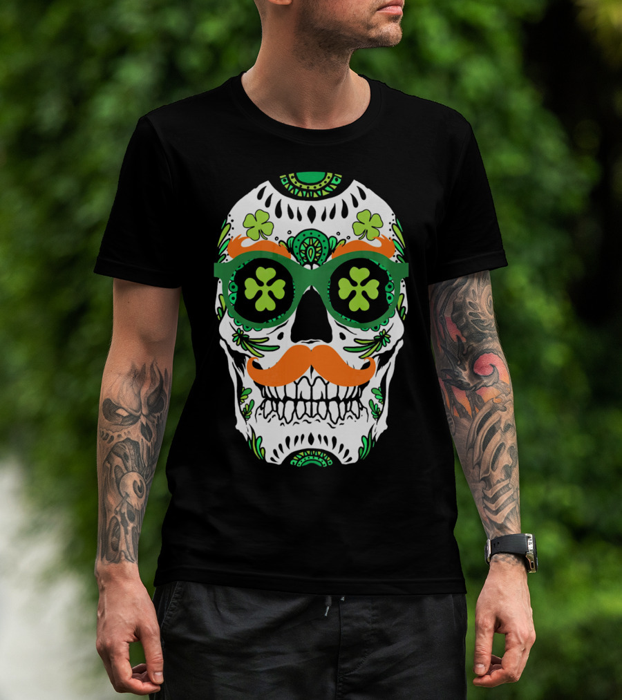Sugar Skull Clover Mustache St. Patrick's Day T-Shirt