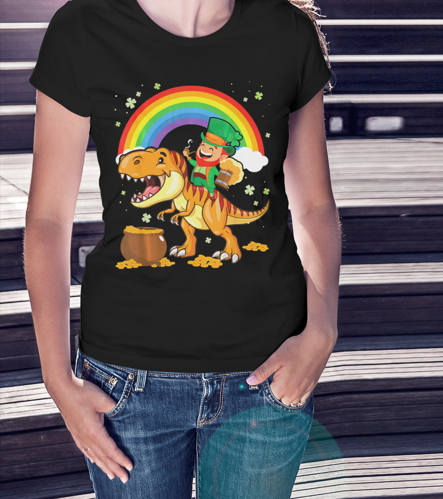 The Leprechaun Drinking Beer Riding Dinosaur Under Rainbow with Pot of Gold T-shirt is designed for everyday wear and a consistent fit. Fabric is pre-shrunk ring-spun cotton with durable stitching. See the size chart below for exact measurements.