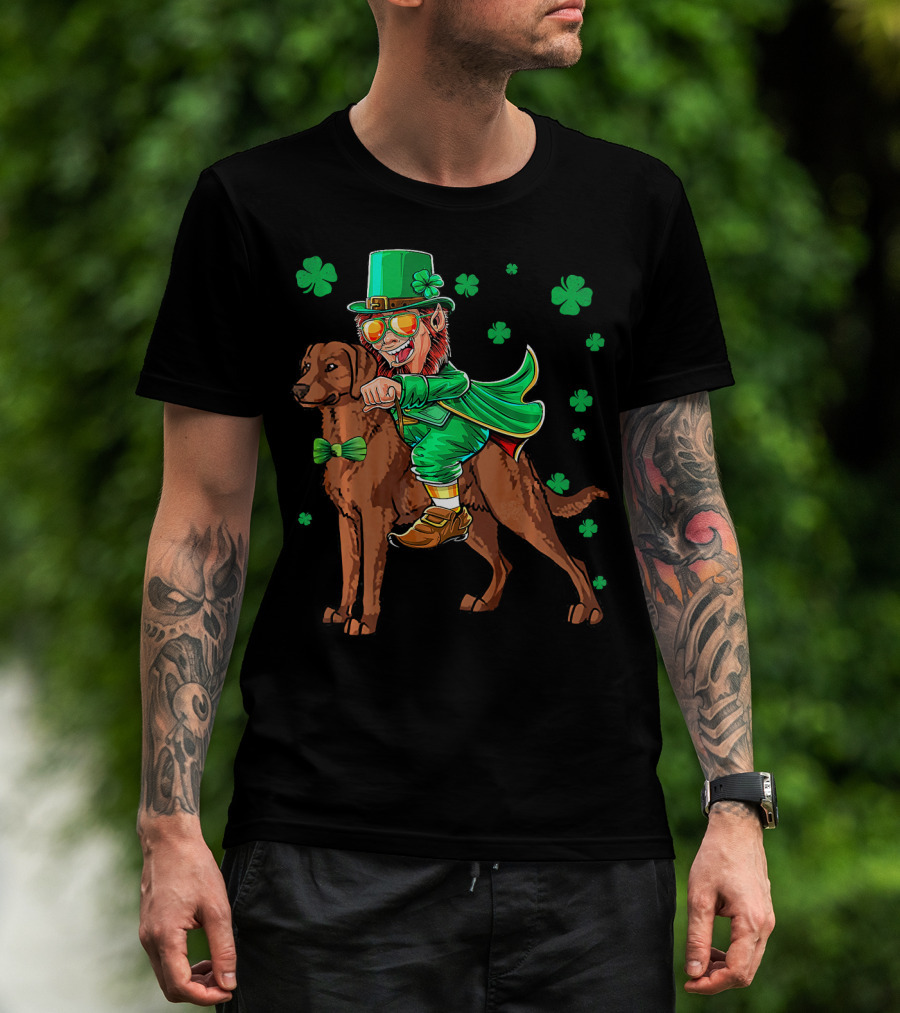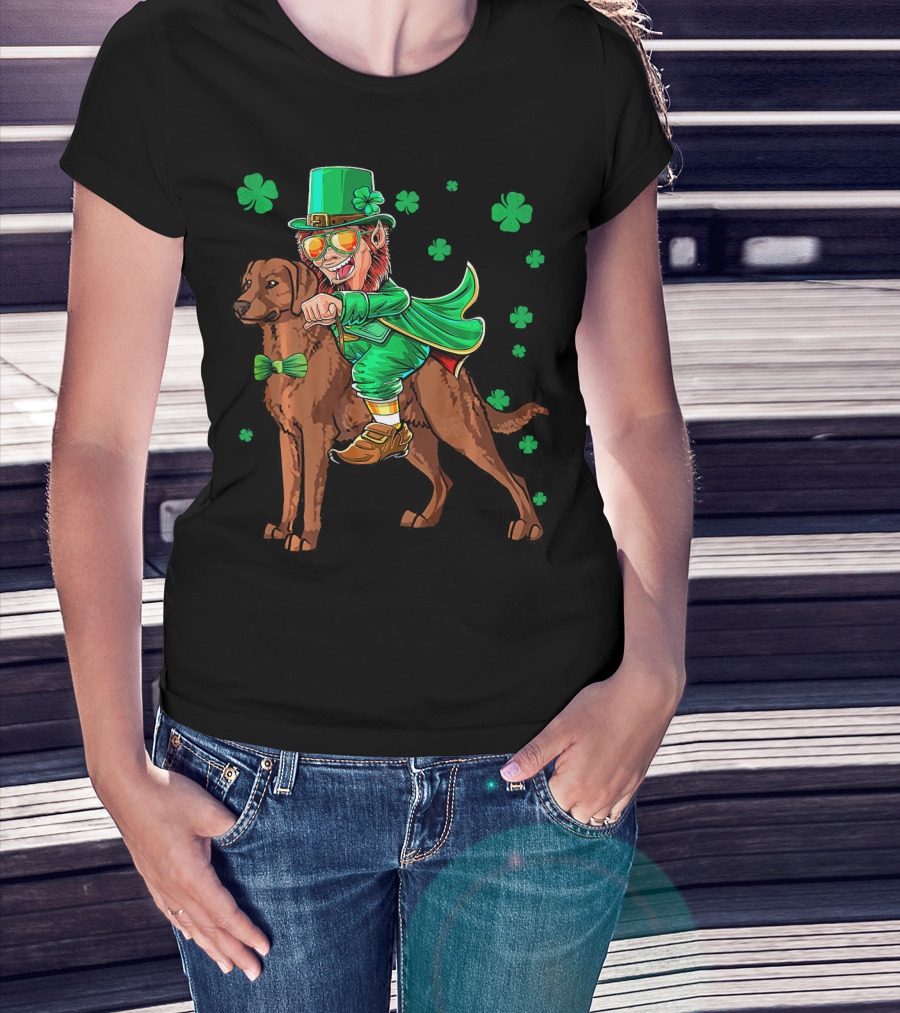 Leprechaun Riding Chesapeake Bay Retriever With Shamrocks T-Shirt