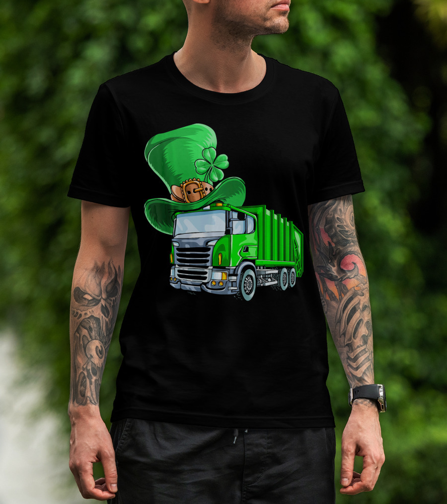 St Patricks Day Garbage Truck With Leprechaun Hat And Four-Leaf Clover T-Shirt