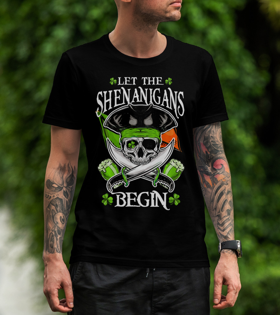 LET THE SHENANIGANS BEGIN SKULL PIRATE IRISH FLAG SHAMROCK T-Shirt