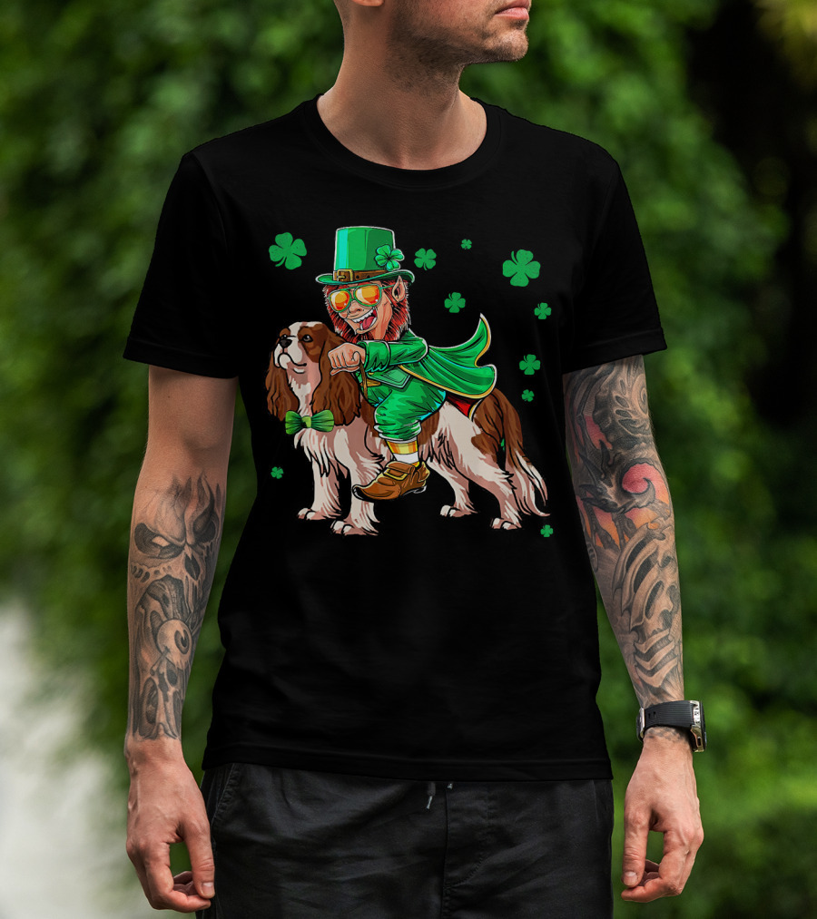 Leprechaun Riding Cavalier King Charles Spaniel With Shamrocks T-Shirt