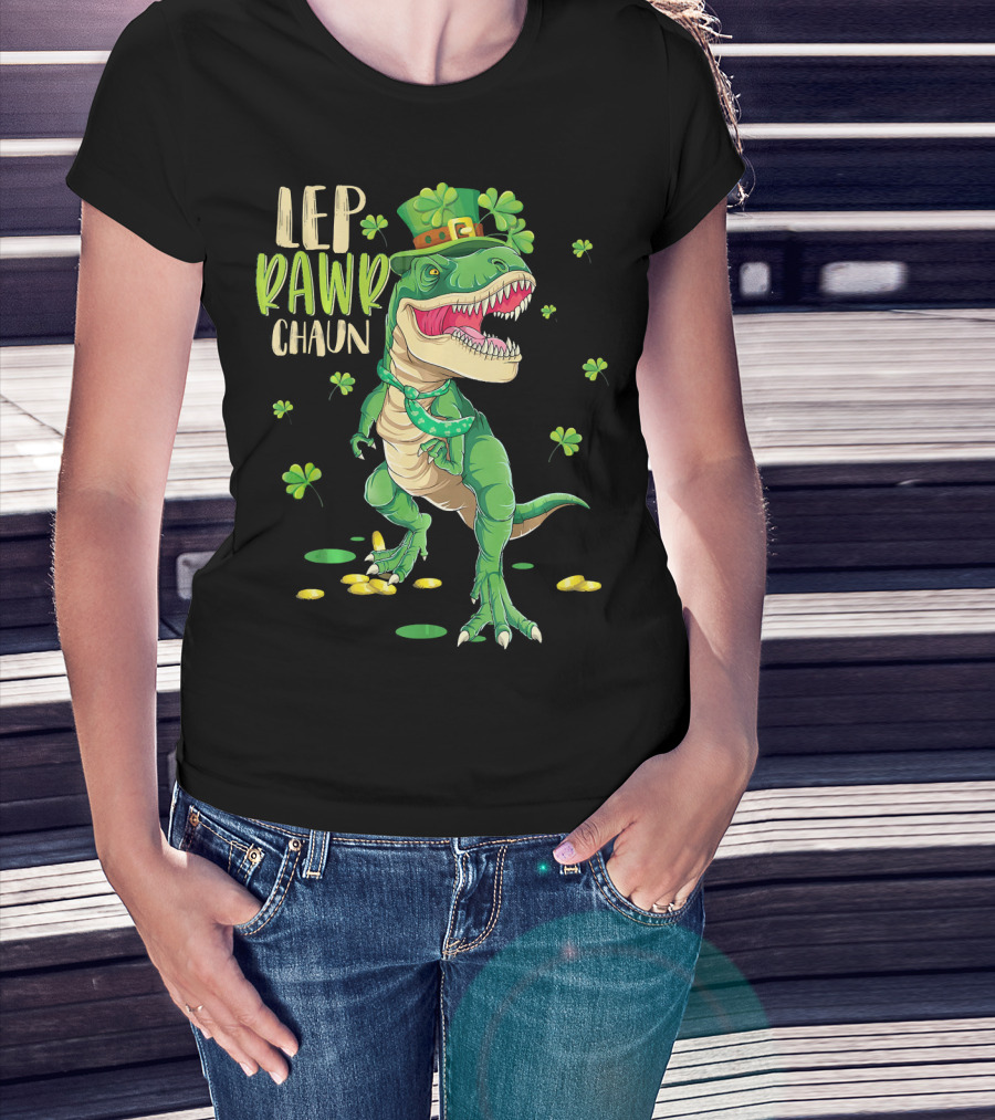 Leprawrchaun St. Patrick's Day Dinosaur With Shamrocks And Gold Coins T-Shirt