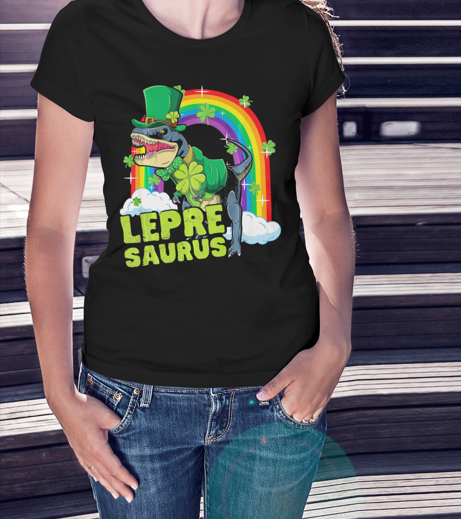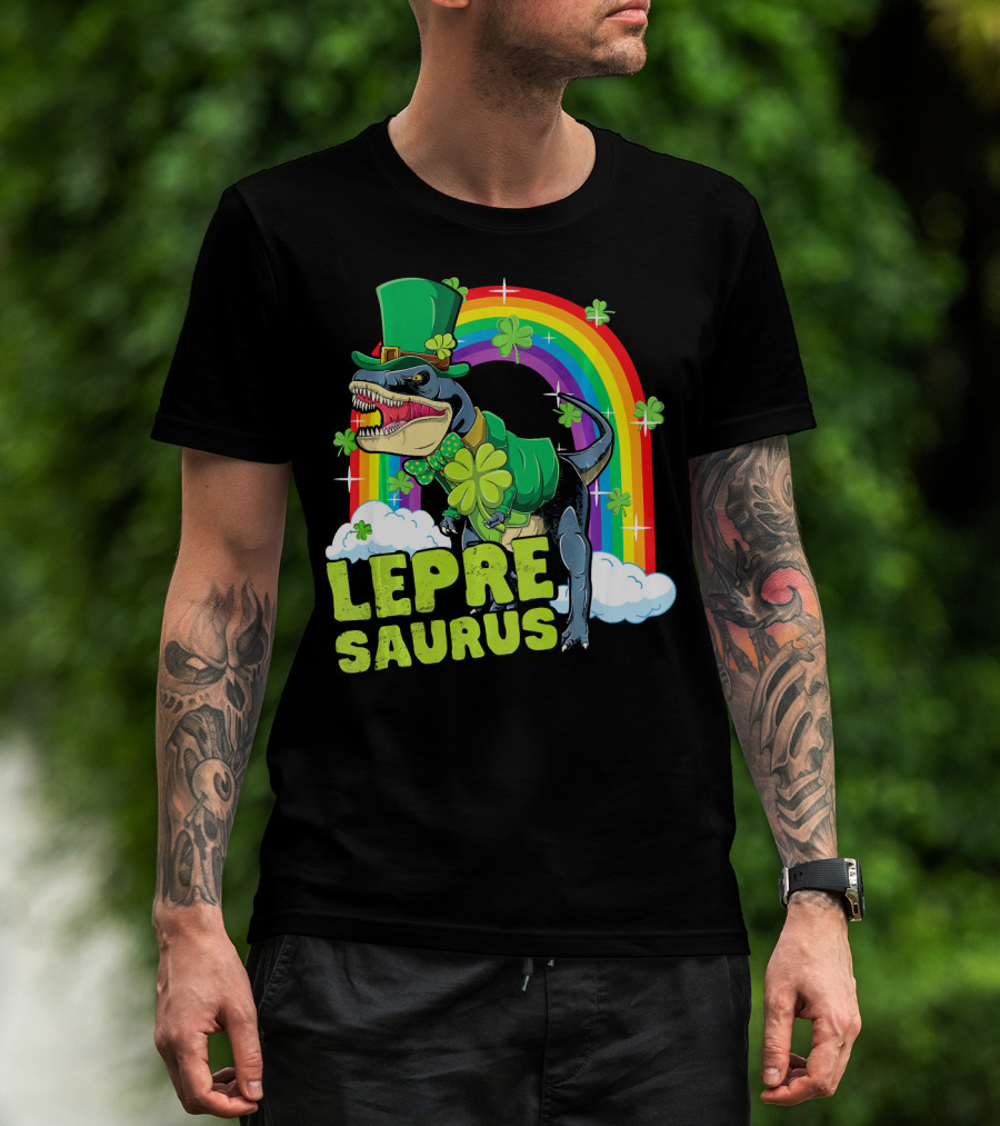 Lepresaurus Dinosaur With Shamrocks And Rainbow St Patrick's Day T-Shirt