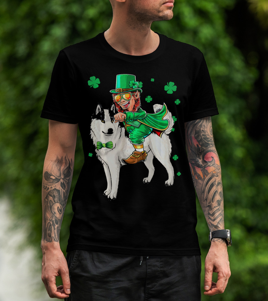 Leprechaun Riding Siberian Husky With Shamrock Bow Tie And Clover Background T-Shirt
